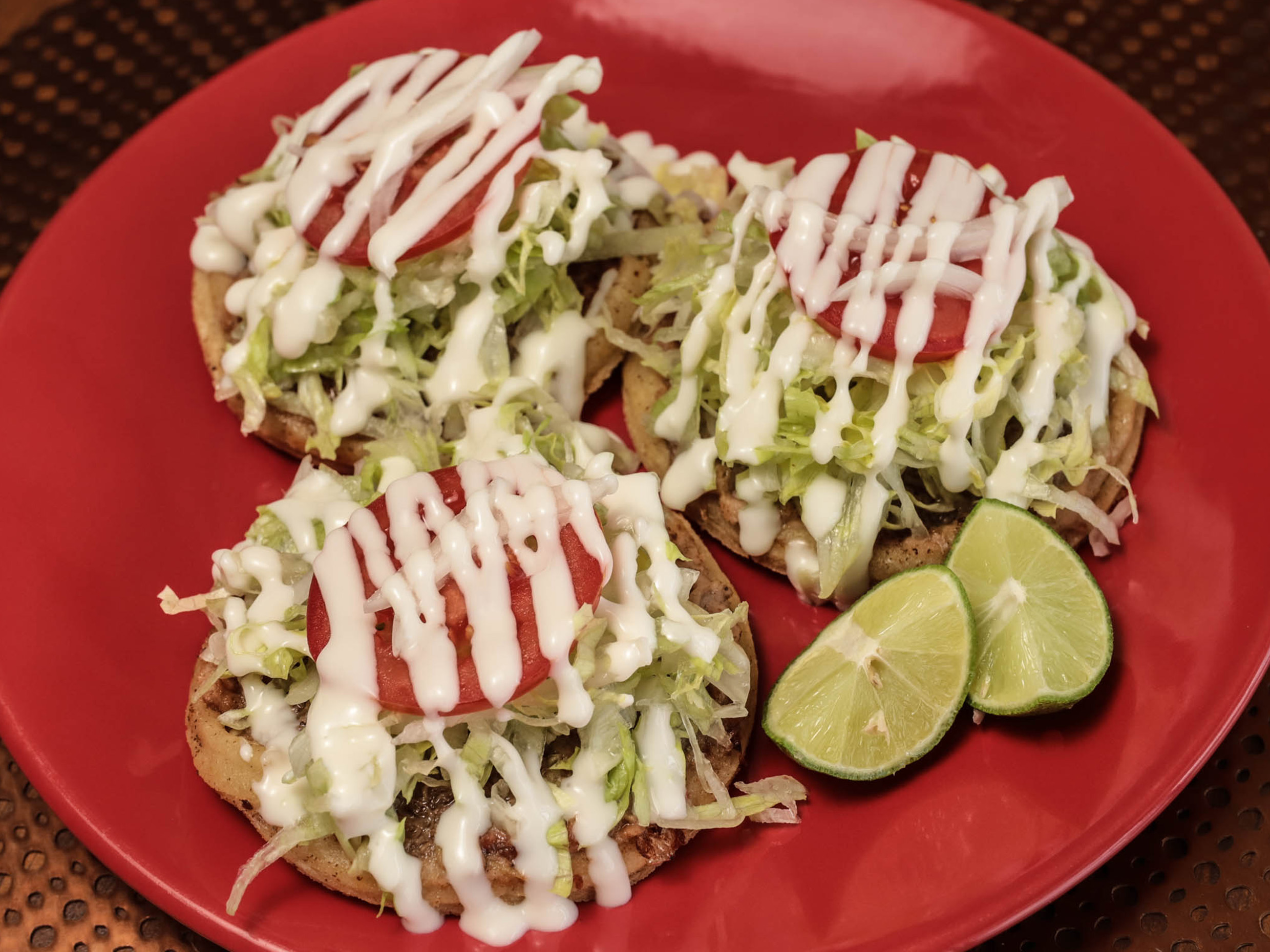 Incluye 3 sopes, lechuga, tomate, cebolla, limón, crema y salsa.