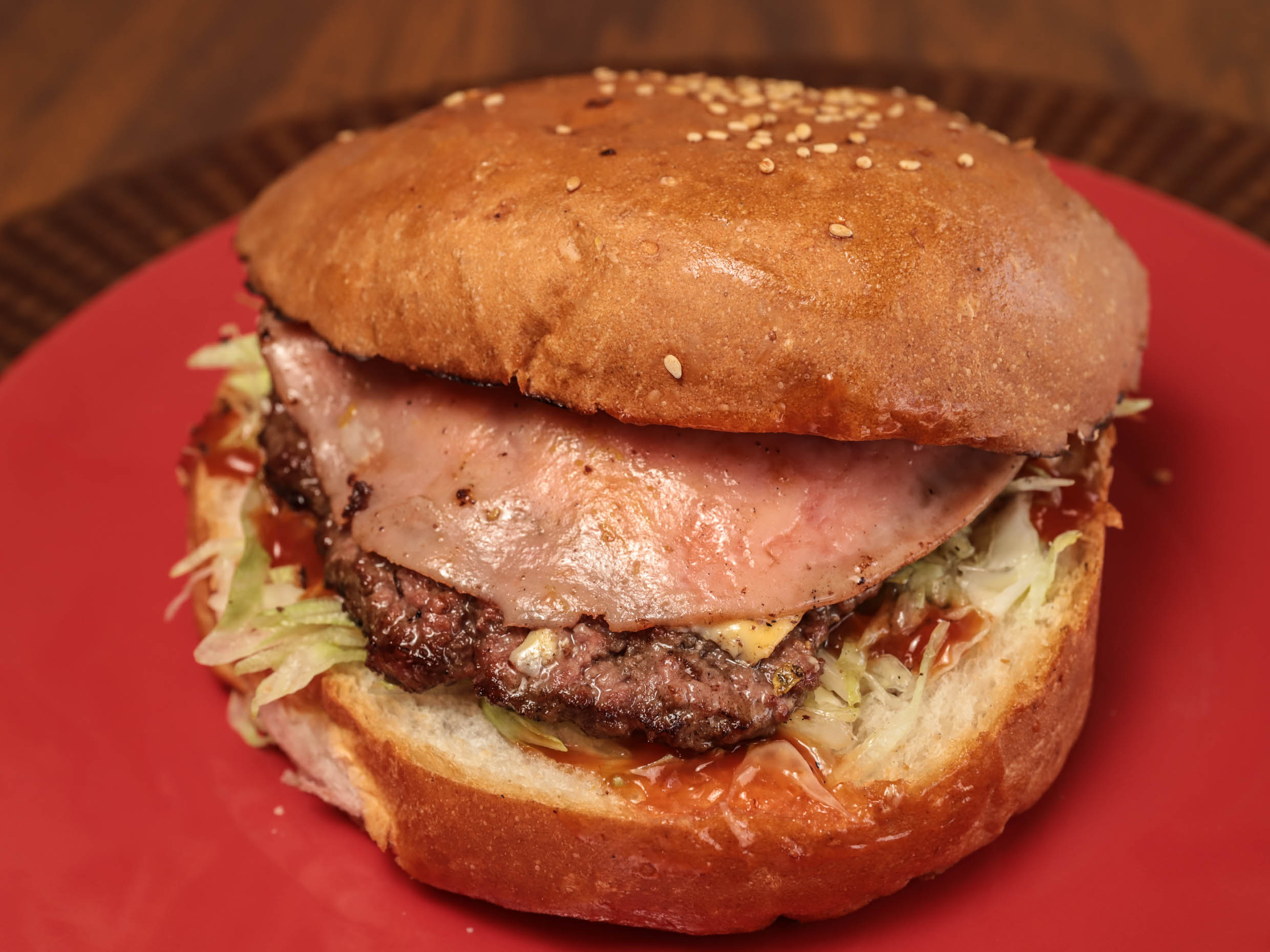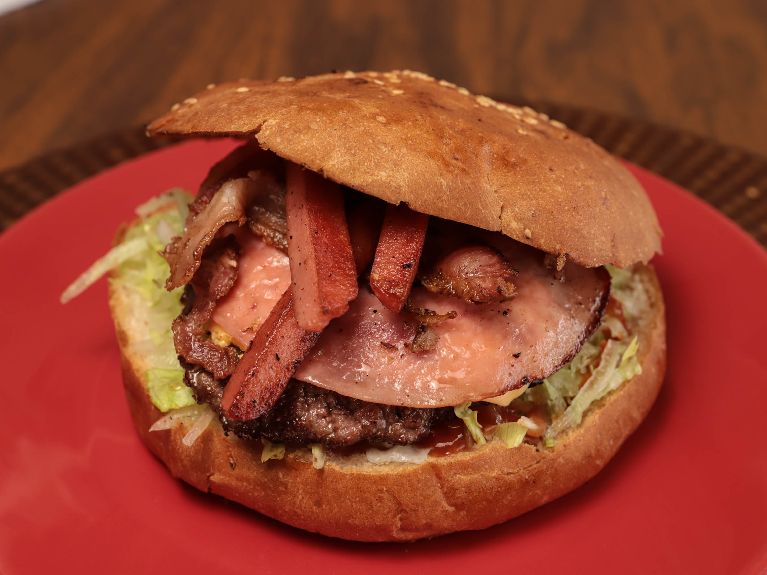 Incluye lechuga, tomate, cebolla, chiles curtidos, carne, queso amarillo, jamón, salchicha, piña, tocino y aderezos.