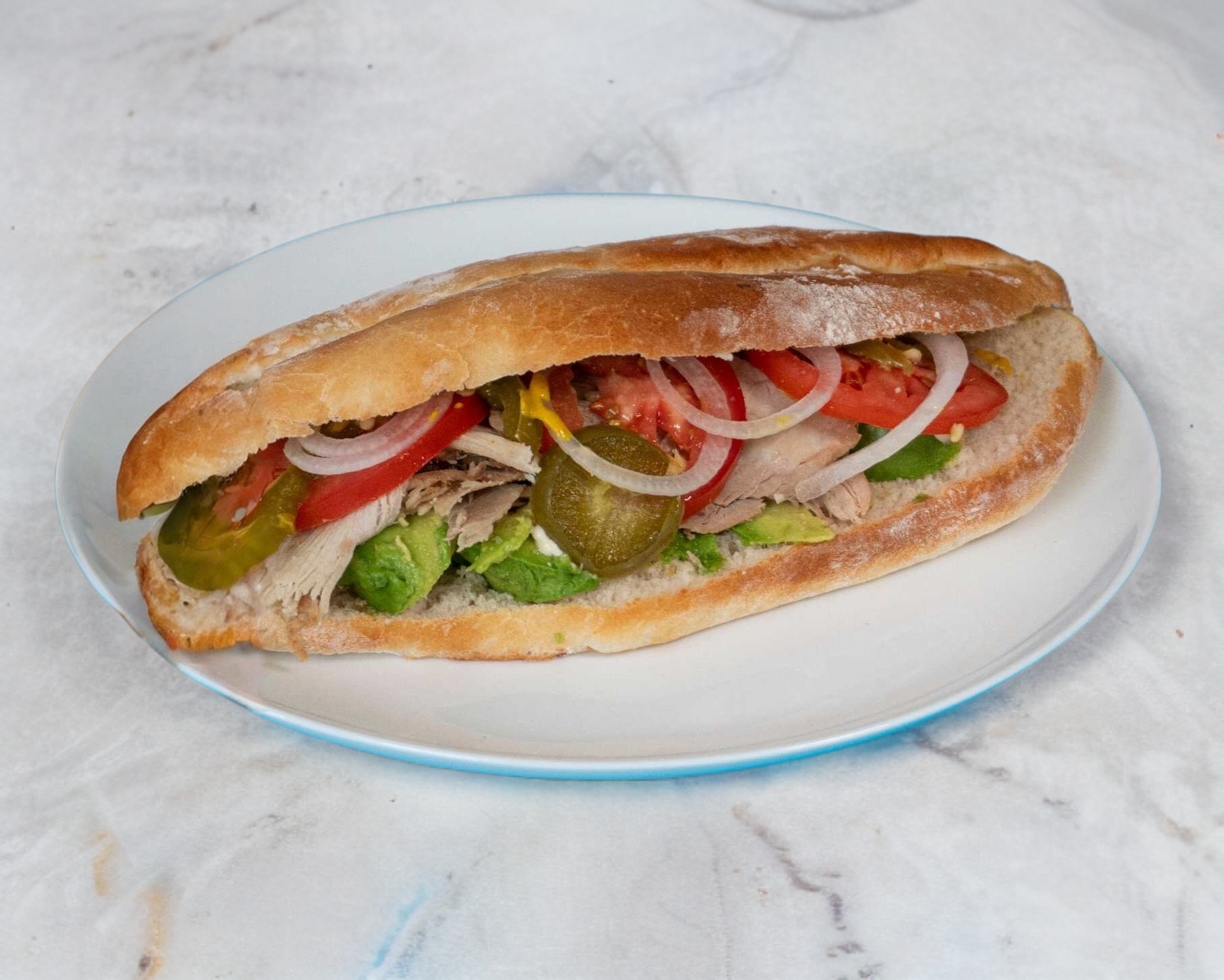 Adobada, queso blanco, aguacate, tomate, cebolla, mayonesa, mostaza y chiles curtidos.