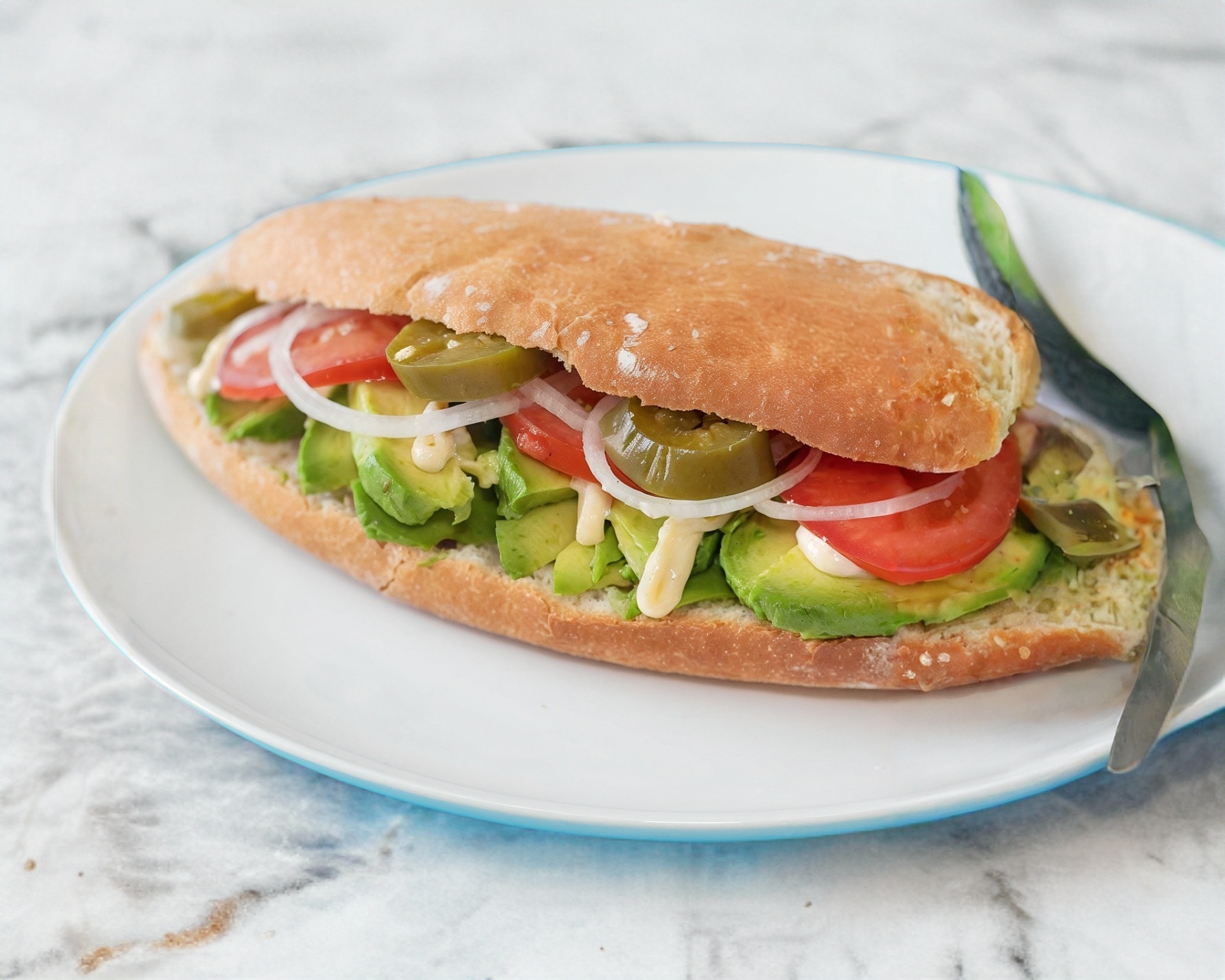 Aguacate, tomate, cebolla, mayonesa, mostaza y chiles curtidos.