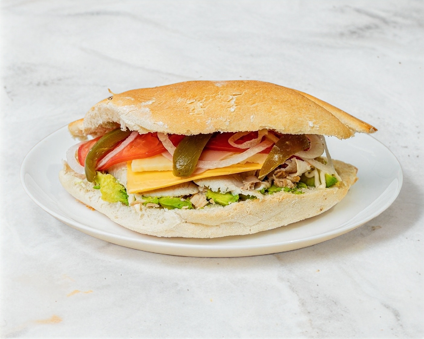 Jamón, queso blanco, queso amarillo, queso de puerco, aguacate, tomate, cebolla, mayonesa, mostaza y chiles curtidos.