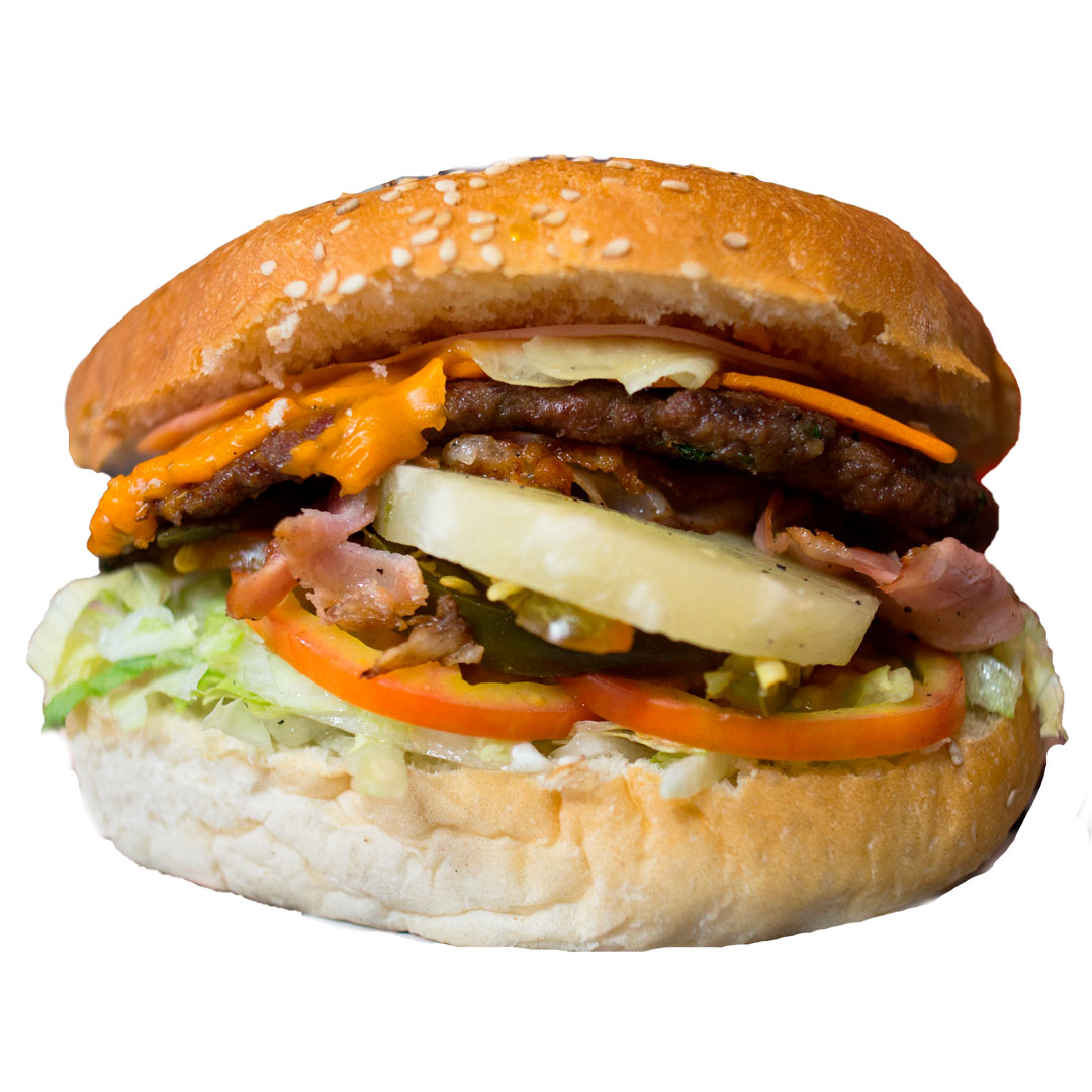 Hamburguesa sencilla con queso amarillo, mostaza, mayonesa, catsup, lechuga, tomate, cebolla y jalapeño.