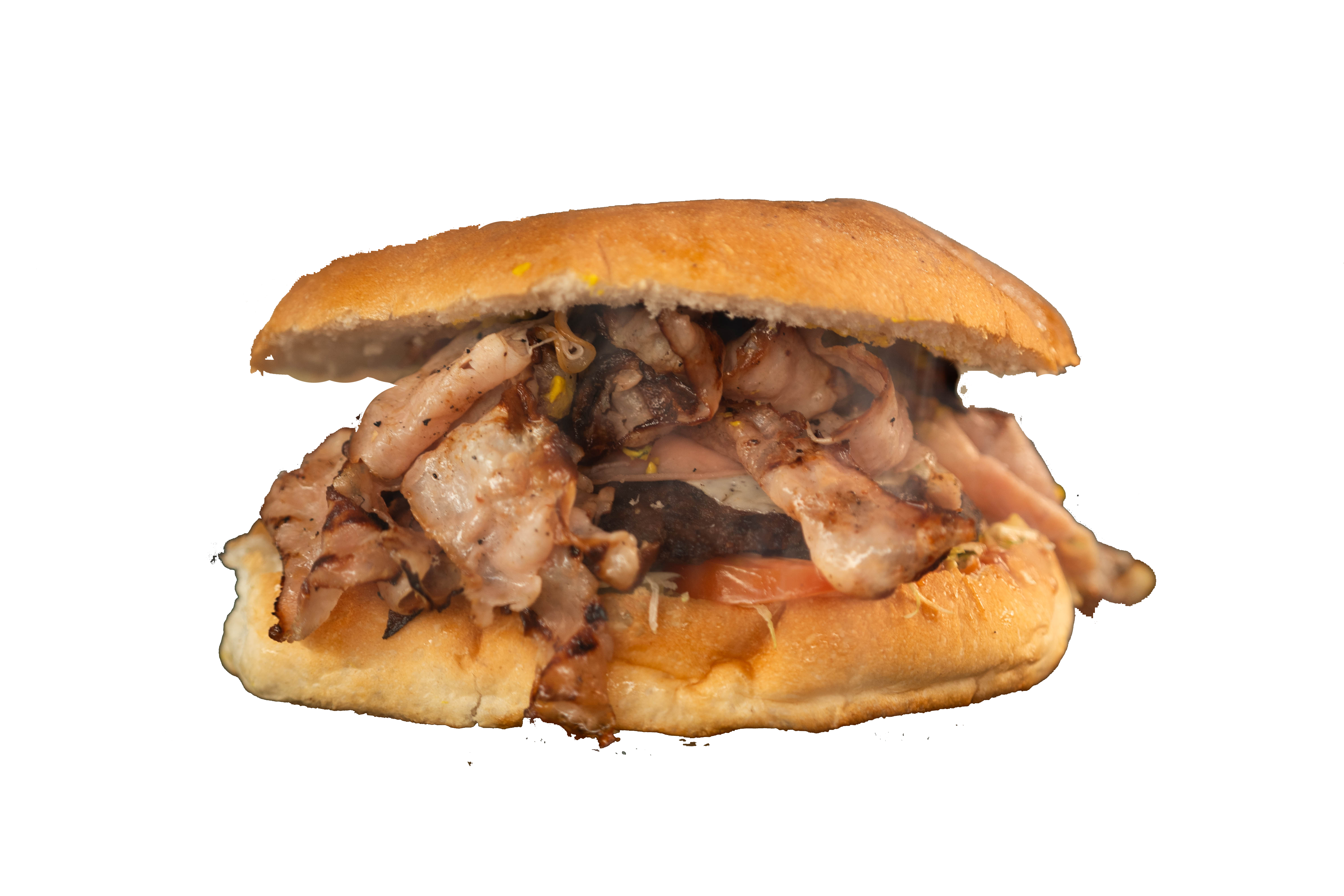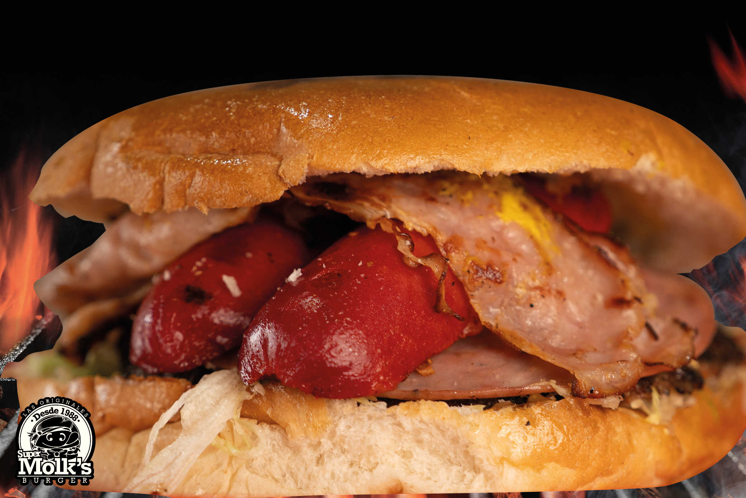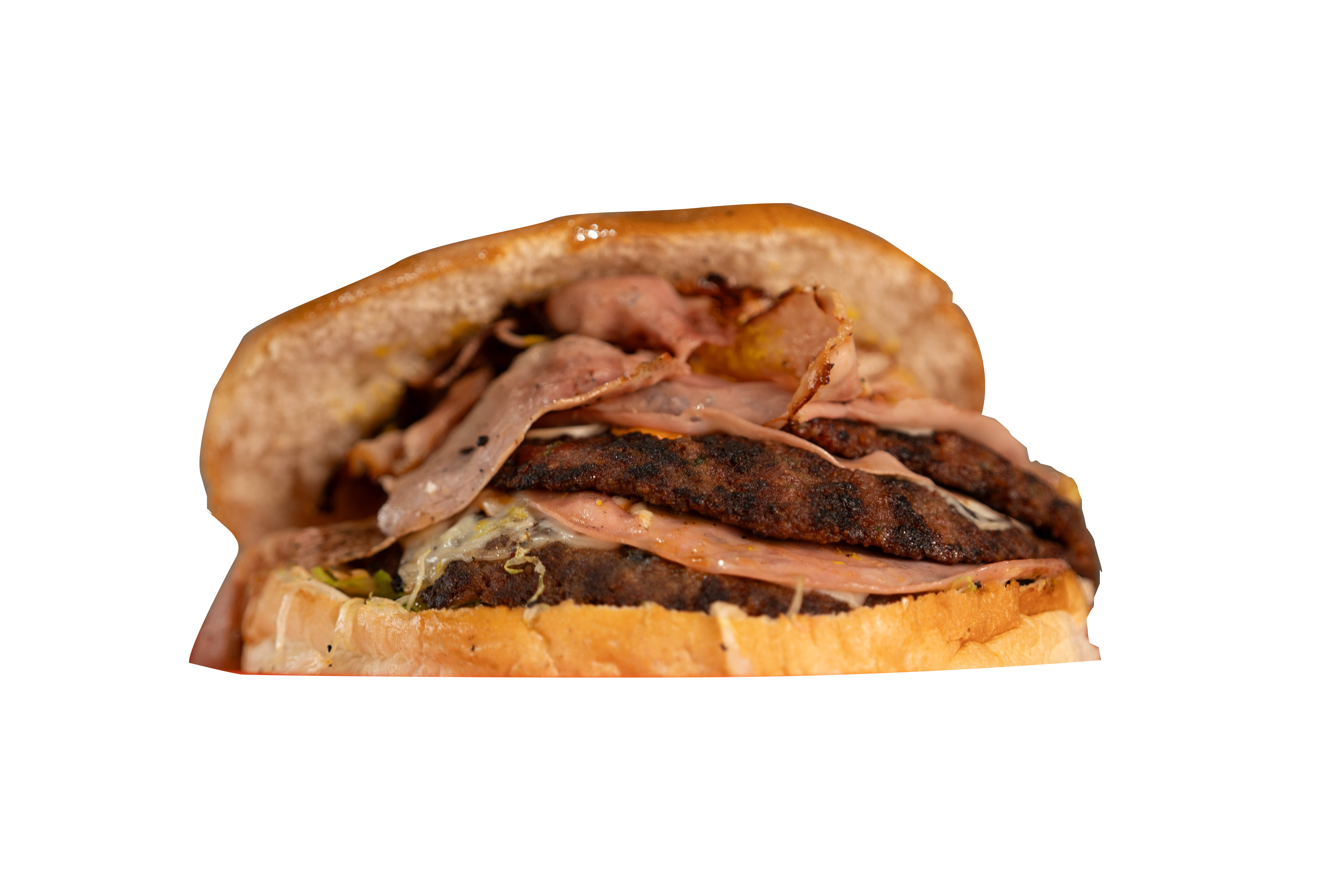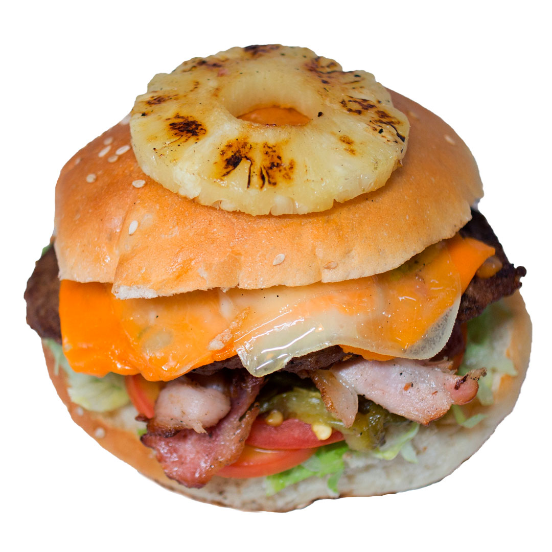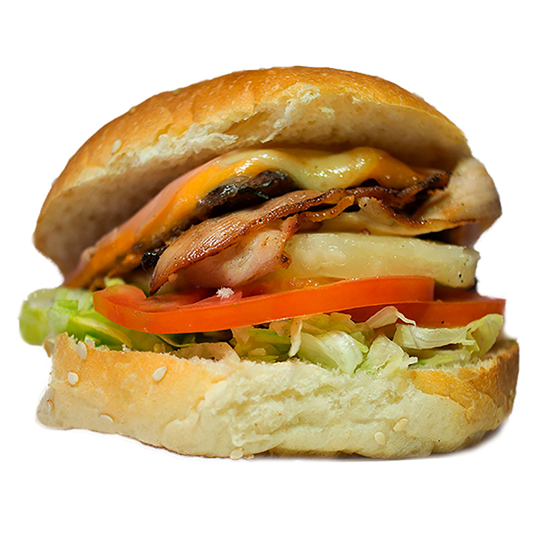 Pan integral, carne de sirloin, queso blanco, amarillo, piña, tocino, aderezo ranch o chipotle, mostaza, mayonesa, catsup, lechuga, tomate, cebolla y jalapeño.