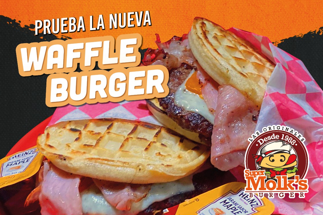 ¡Nueva! Exclusiva y deliciosa. Carne 100% Sirloin, Triple Tocino, Doble queso Blanco, Queso Amarillo, Salchicha Frita, todo esto entre dos Waffles Esponjosos.