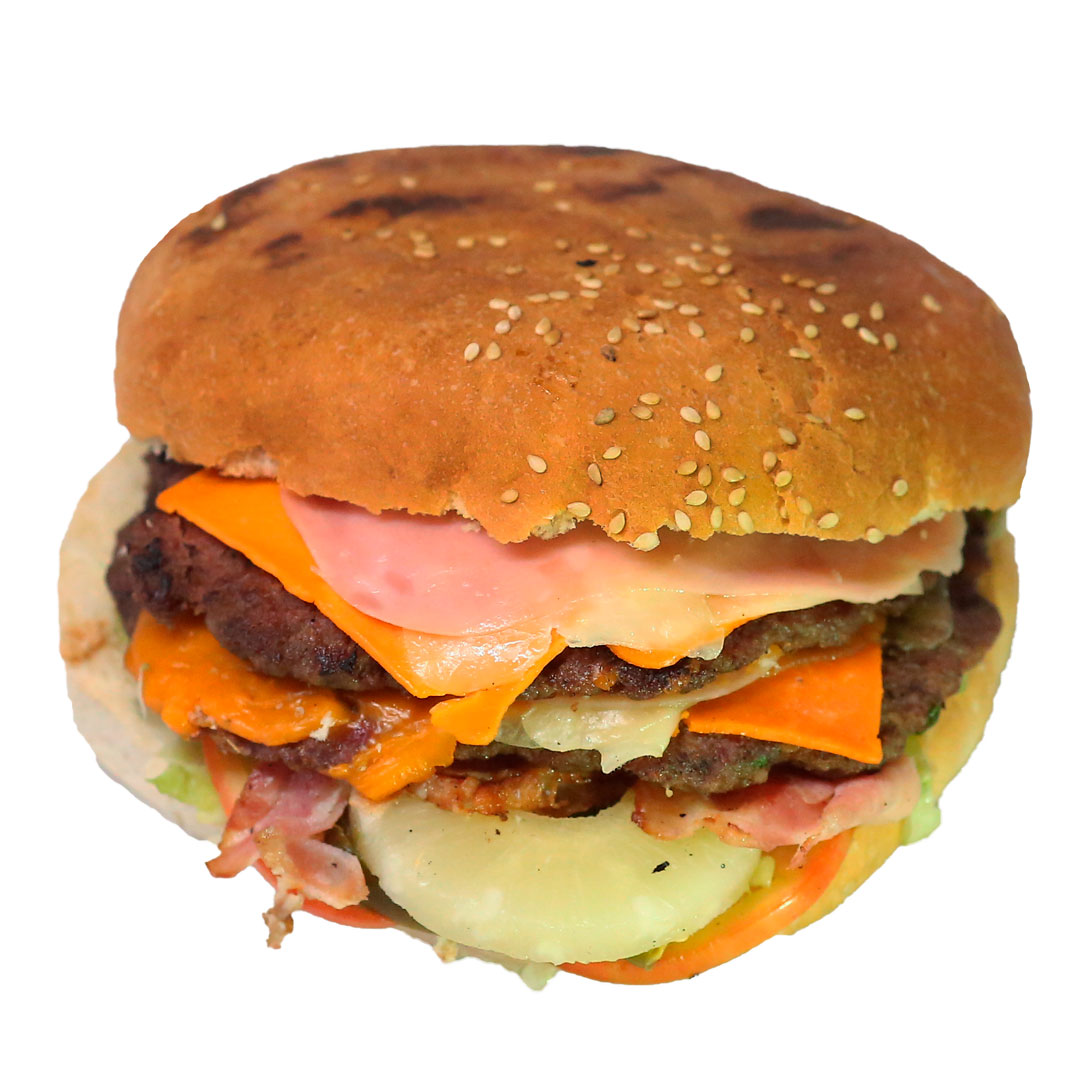 Doble carne, doble queso, blanco, amarillo, jamón, piña, tocino, mostaza, mayonesa, catsup, lechuga, tomate, cebolla y jalapeño.