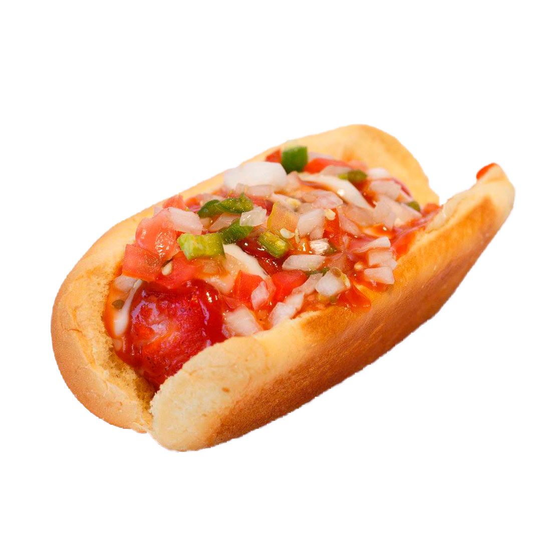 Salchicha de pavo envuelta en tocino, cebolla, jitomate, jalapeño, tocino, mostaza, catsup y mayonesa.