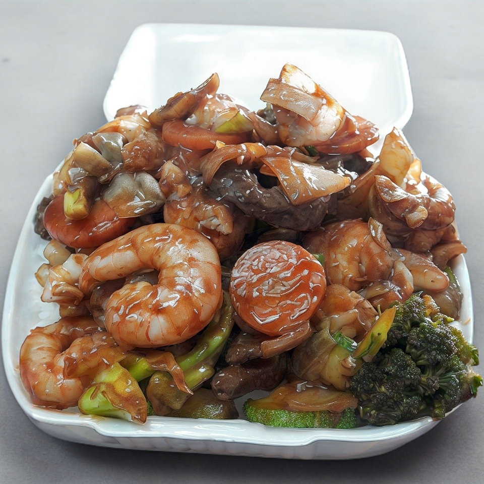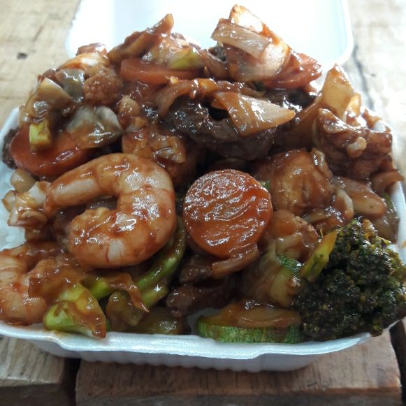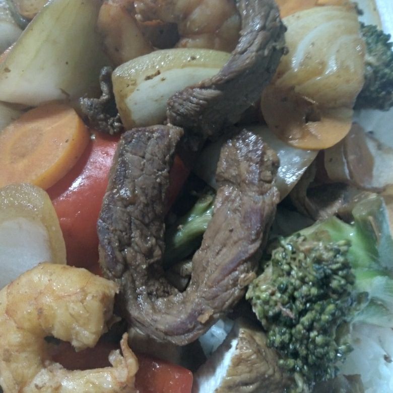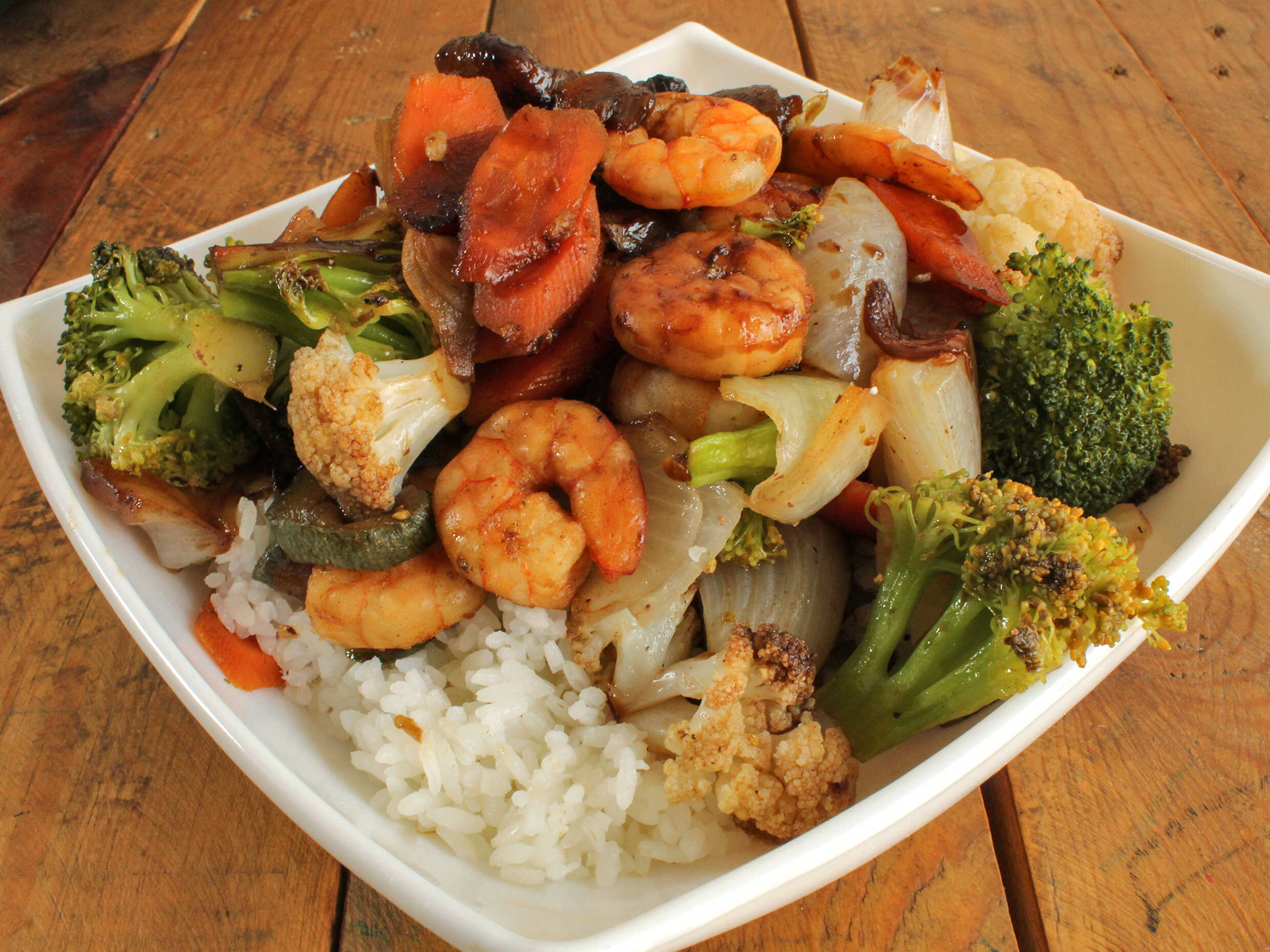 Verduras salteadas sobre una cama de arroz al vapor con res, pollo o camarón.