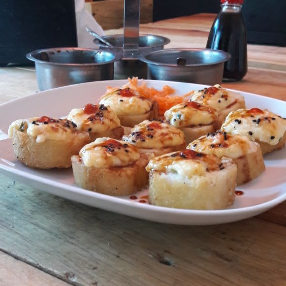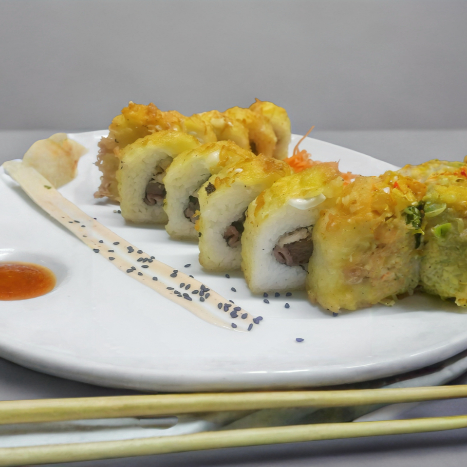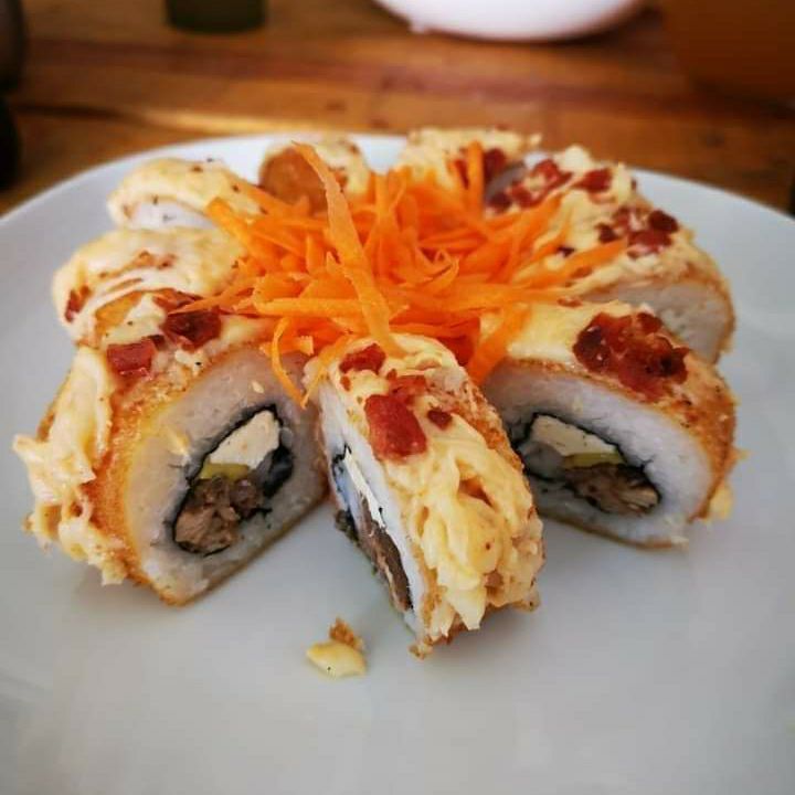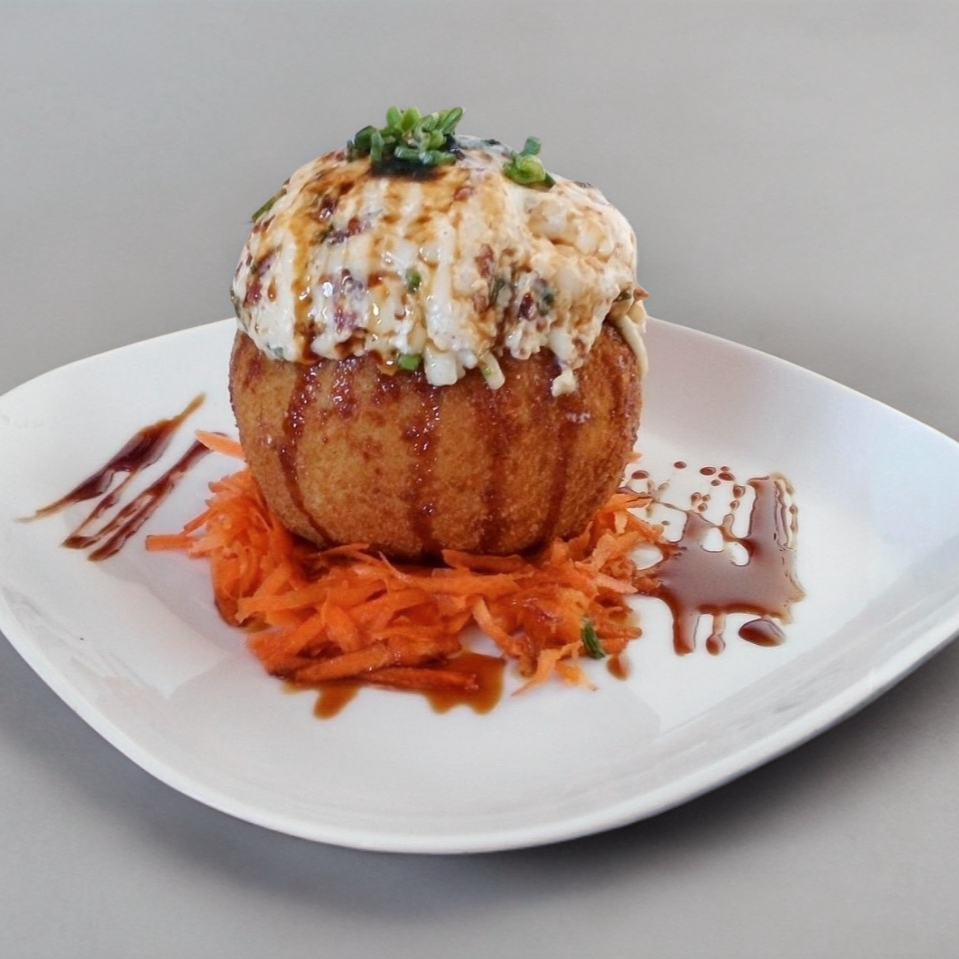 Bola de arroz empanizada rellena de tampico, res, pollo, queso chihuahua, Philadelphia y topping de tocino horneado.