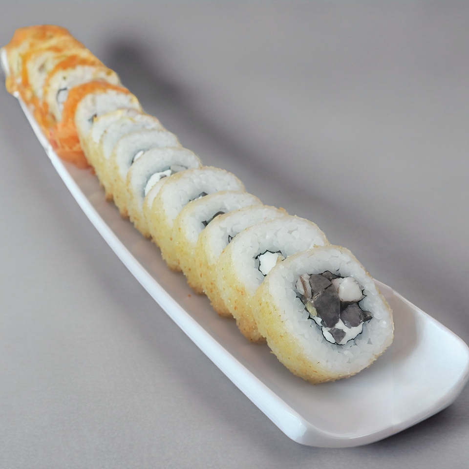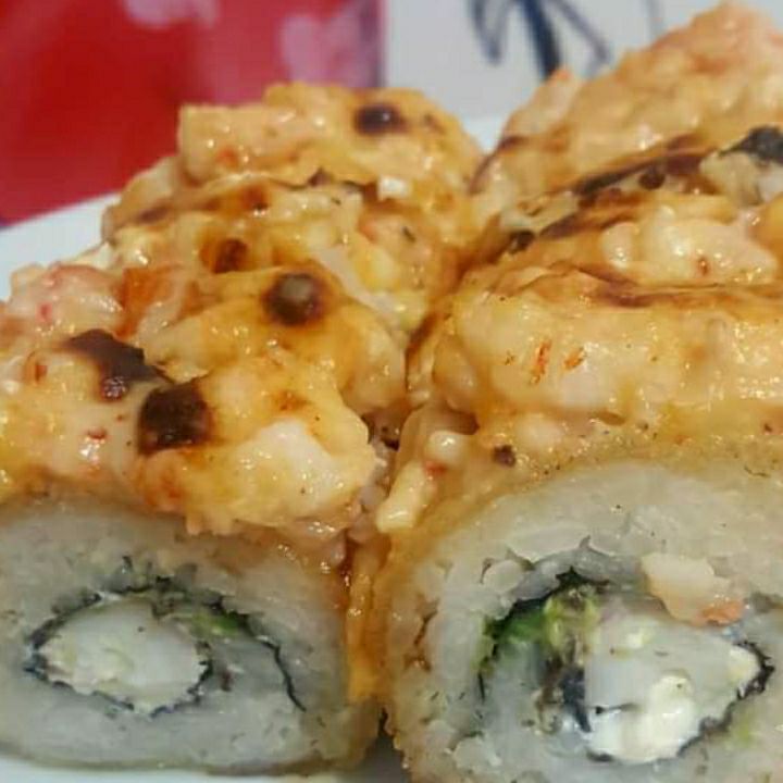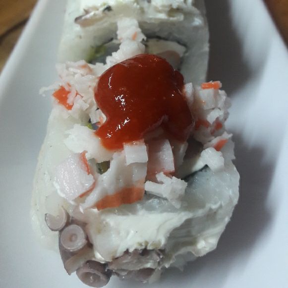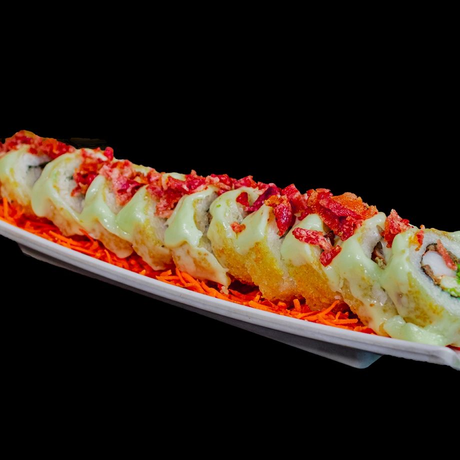 Rollo empanizado, por dentro pulpo, encima topping de camarón spicy bañado en salsa de anguila.