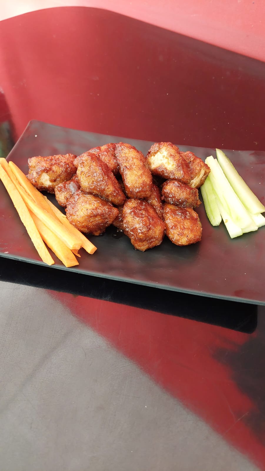 Pollo por dentro, tampico y camarón empanizado encima bañado en salsa BBQ