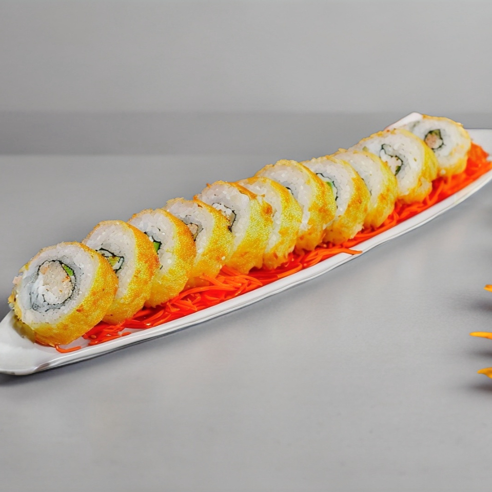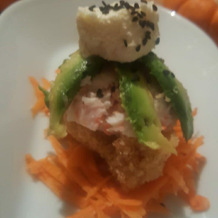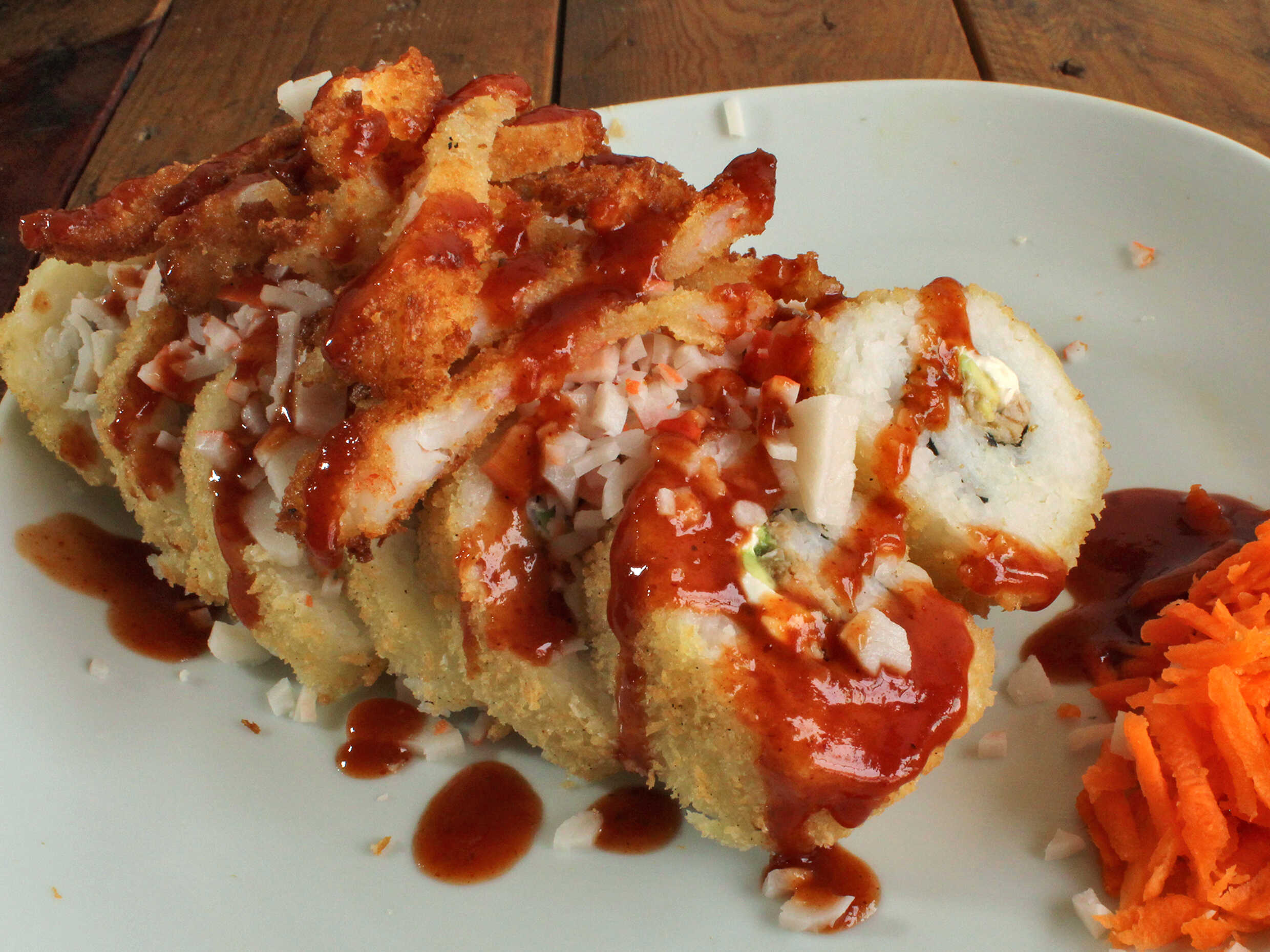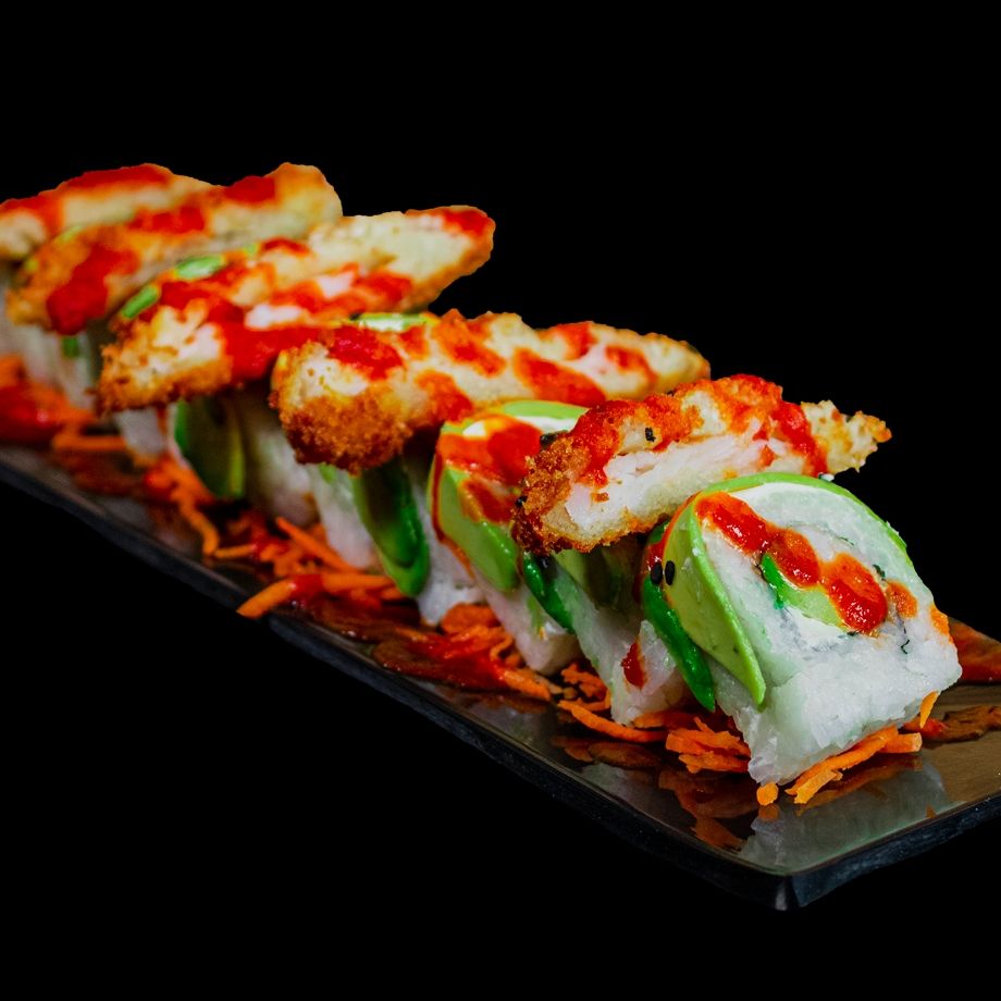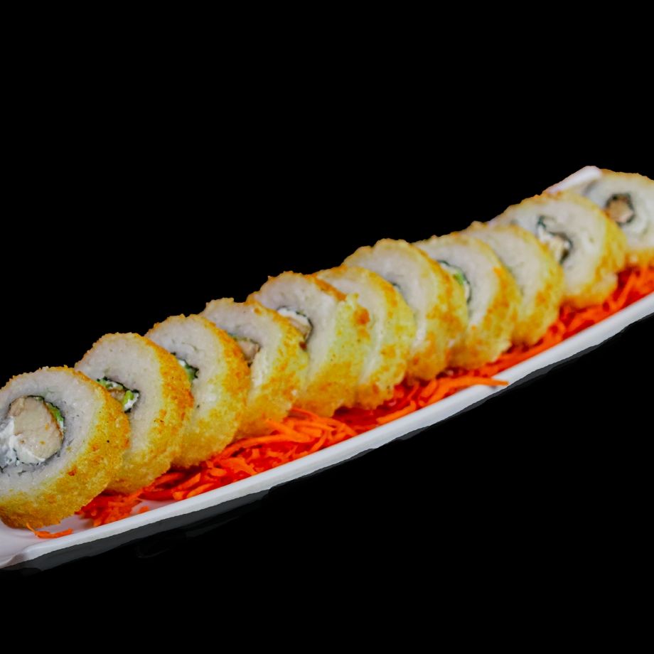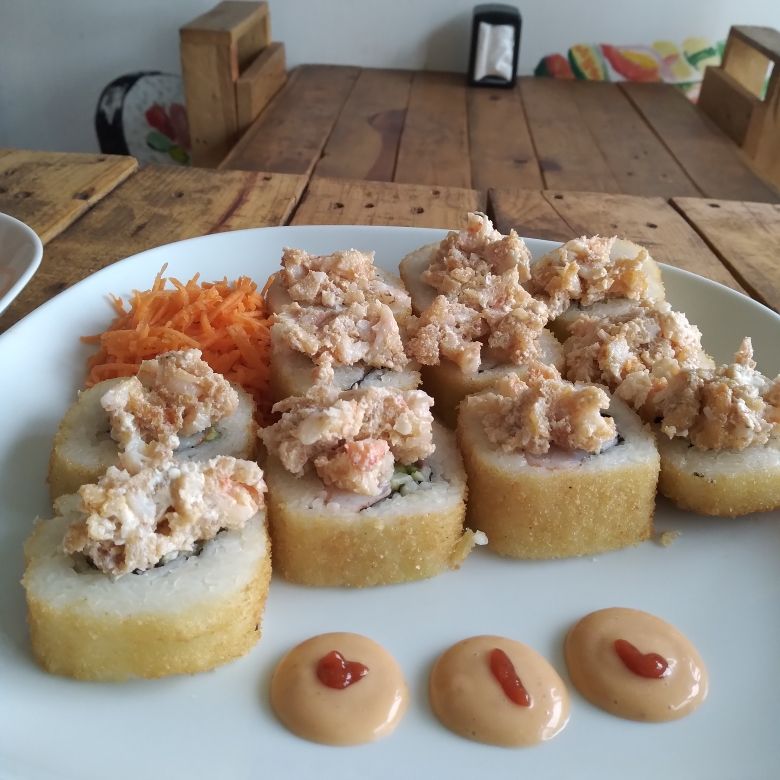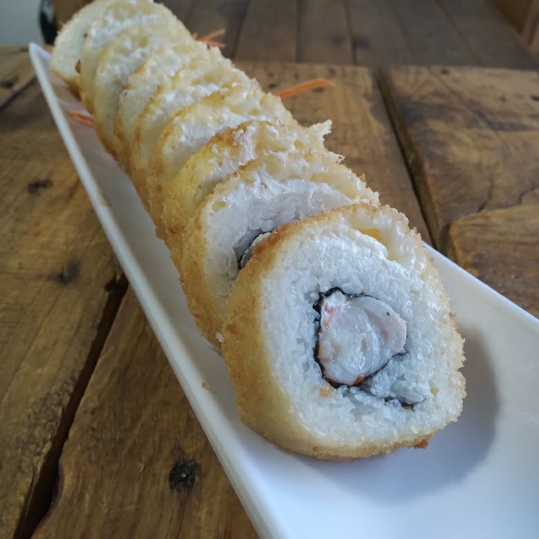 Rollo empanizado, por dentro surimi, encima topping de camarón spicy bañado en salsa de anguila.