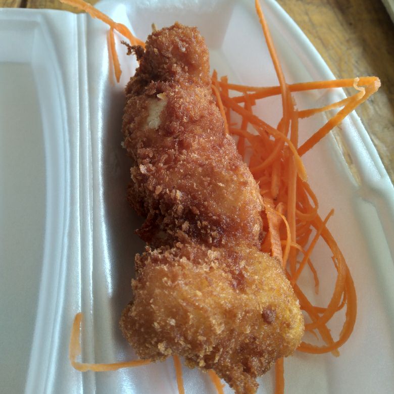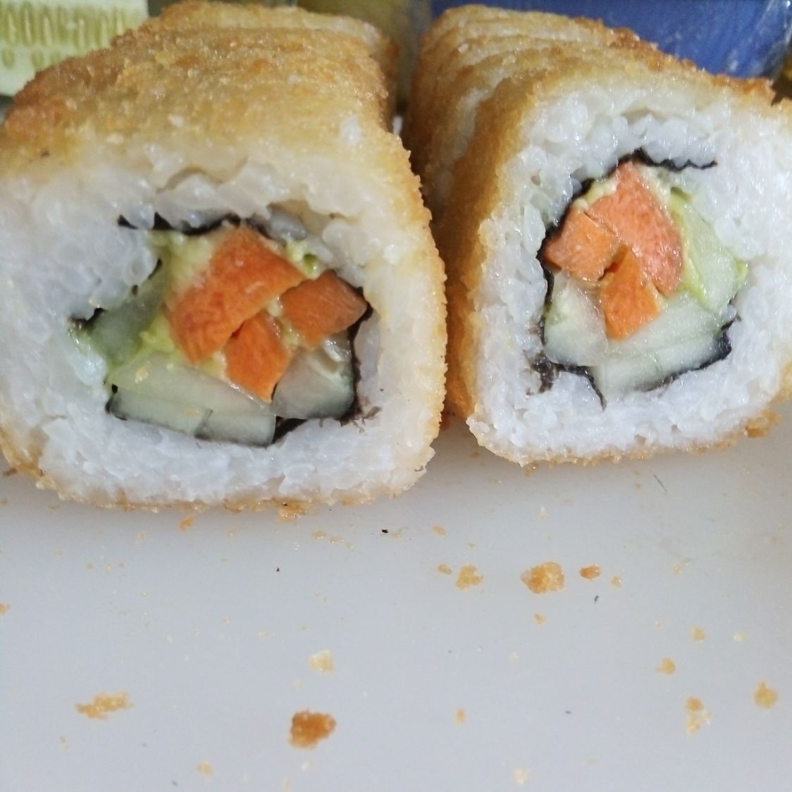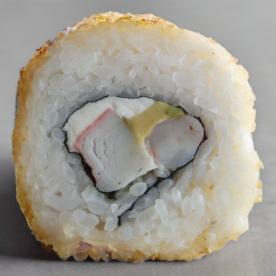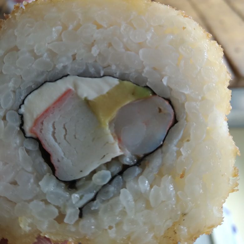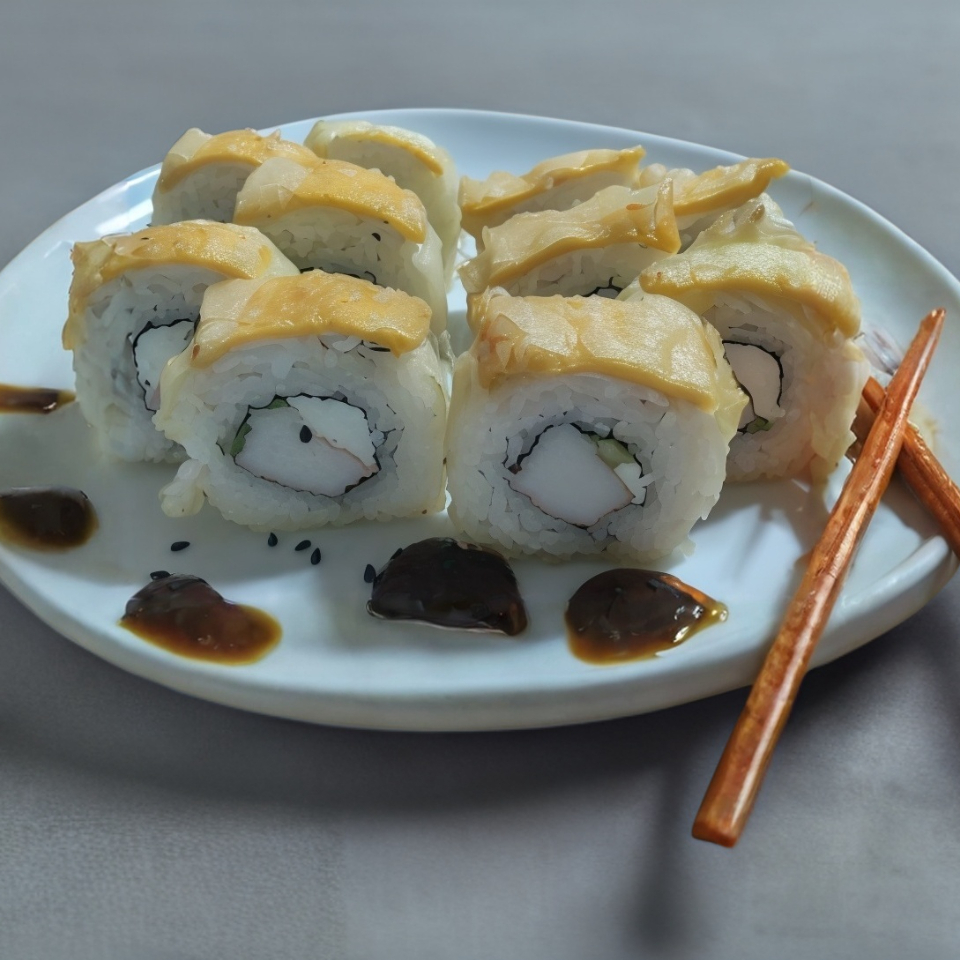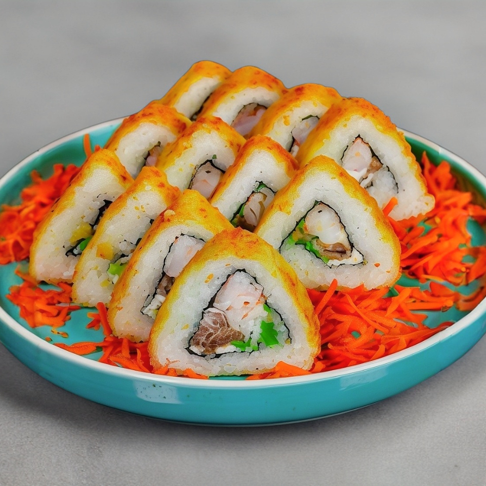Rollo empanizado, por dentro surimi, encima topping de camarón spicy bañado en salsa de anguila.