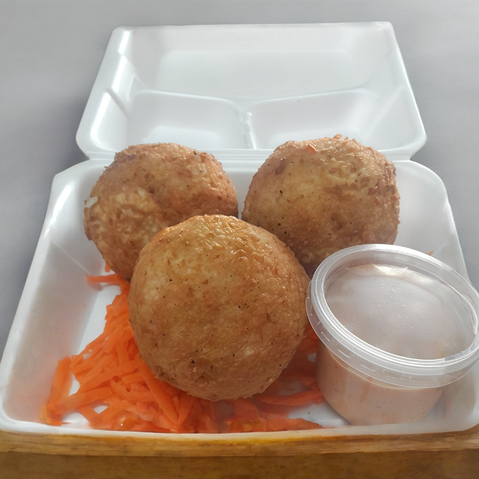 Tres bolas de arroz empanizadas, rellenas de camarón, queso chihuahua y Philadelphia puede ser dulce, picosa o BBQ.