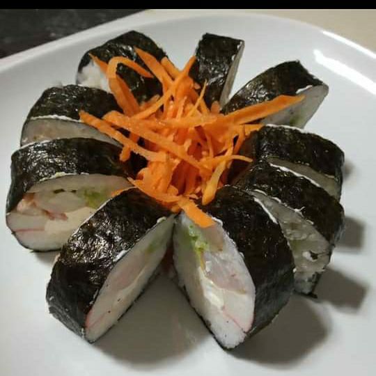 Sushi de 10 rebanadas, Res (60 a 80 gramos aprox ), camarón 60 a 80 gramos aprox Y pollo 60 a 80 gramos aprox POR DENTRO