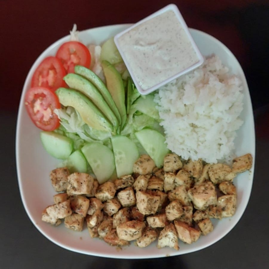 Pollo a la plancha con vinagreta arroz blanco y ensalada