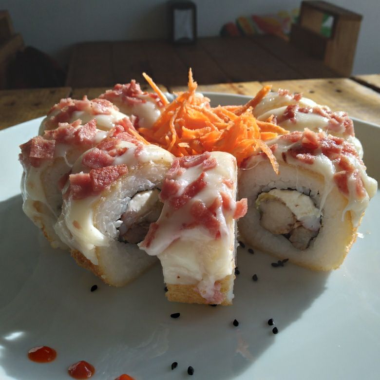 Rollo empanizado, por dentro pollo y tocino, topping de tocino bañado en salsa de anguila.