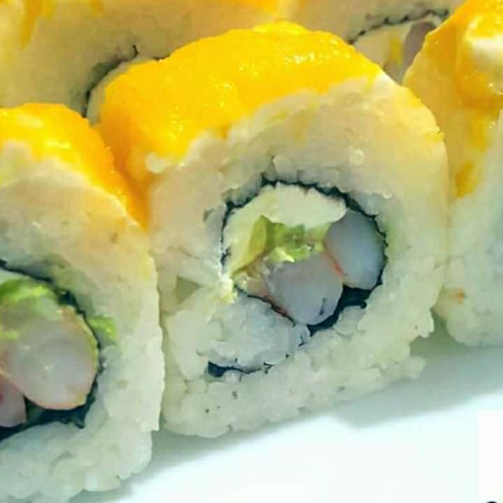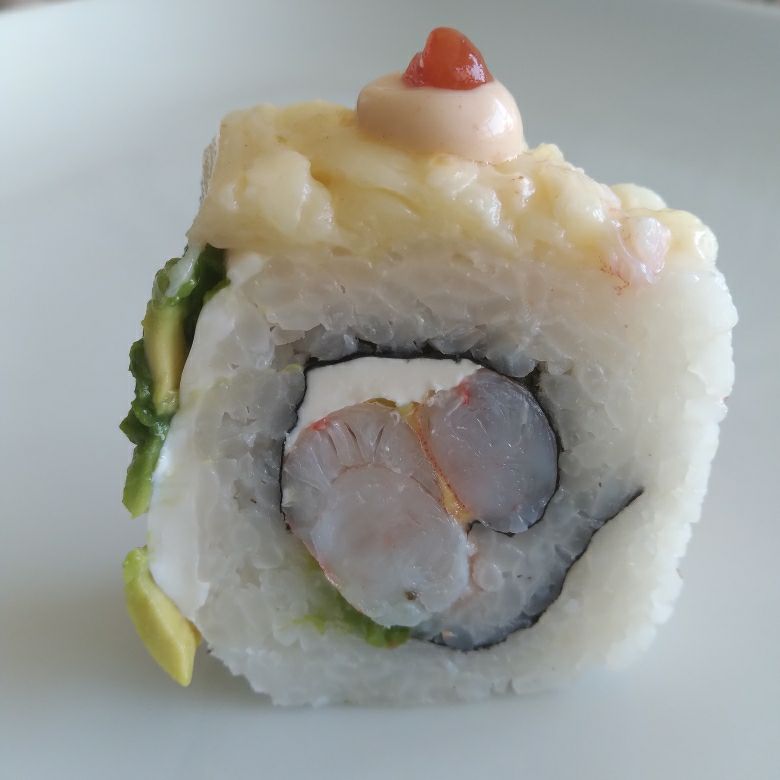 Rollo natural, por dentro camarón por fuera aguacate, topping de camarón spicy bañado en salsa de anguila.