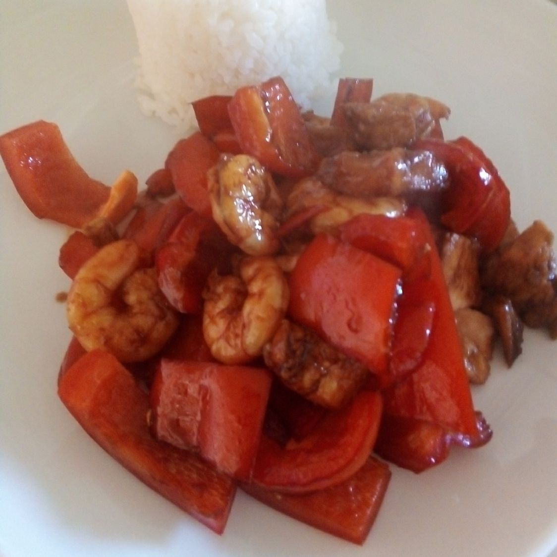 Verduras salteadas agridulces, pimiento morrón y cebolla, sobre una cama de arroz al vapor.