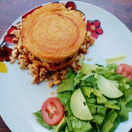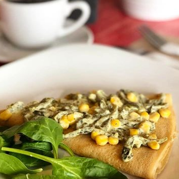 Base de crepa elaborada artesanalmente sobre crepera de 40cm de diámetro y doblada en forma triangular, con un toque de mayonesa y relleno de pollo en salsa poblana y queso gratinado tipo Chihuahua.
