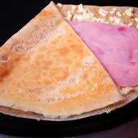 Base de crepa elaborada artesanalmente sobre crepera de 40cm de diámetro y doblada en forma triangular, rellena de jamón y queso gratinado tipo Chihuahua.