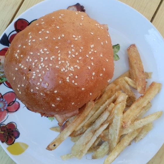 Pan de hamburguesa de la casa elaborado artesanalmente, con un toque de mayonesa, cama de lechuga, tomate, salsa catsup, 1 pieza de carne de res de la casa (150gr), jamón, costra de queso blanco tipo Chihuahua, acompañado con papas a la francesa (150gr).