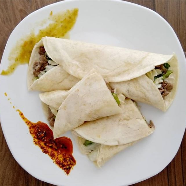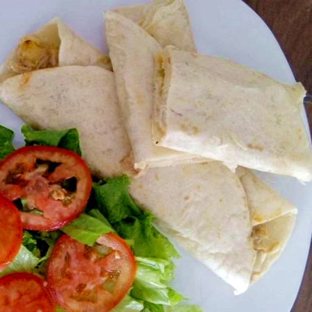 Tortilla de harina con un toque de mayonesa y carne deshebrada en salsa verde picante elaborada de manera casera.