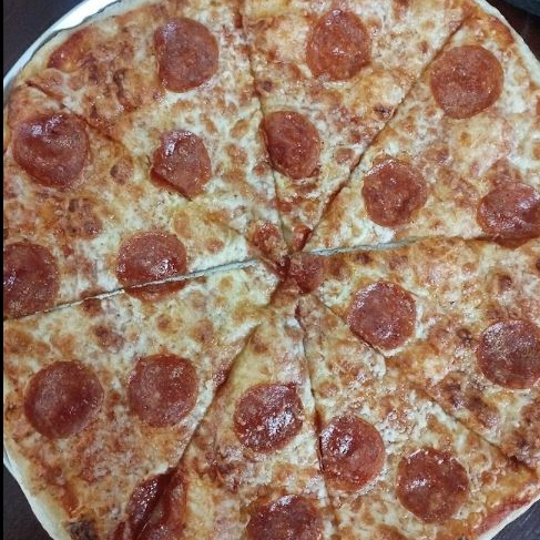 Base de pizza elaborada artesanalmente con masa madre, salsa de tomate casera, queso tipo Chihuahua y pepperoni. 12 rebanadas