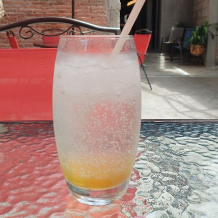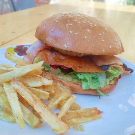 Pan de hamburguesa de la casa elaborado artesanalmente, con un toque de mayonesa, cama de lechuga, tomate, salsa catsup, 1 pieza de carne de res de la casa (150gr), jamón, costra de queso blanco tipo Chihuahua, piña asada y tocino, acompañado con papas a la francesa (150gr).