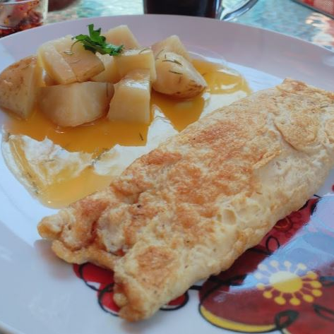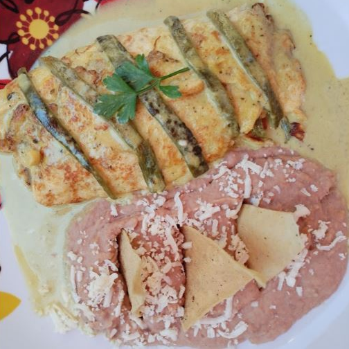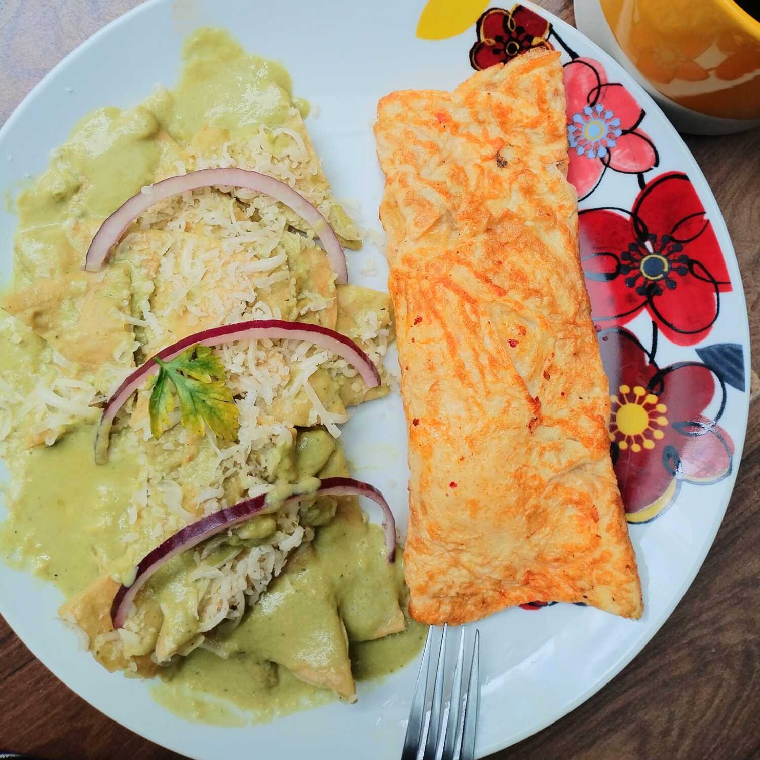 2 piezas de huevo en tortilla, relleno de queso, acompañados con frijoles refritos y papas a la mantequilla. Ingrediente a elegir: carne deshebrada, chicharrón prensado o chile negro.