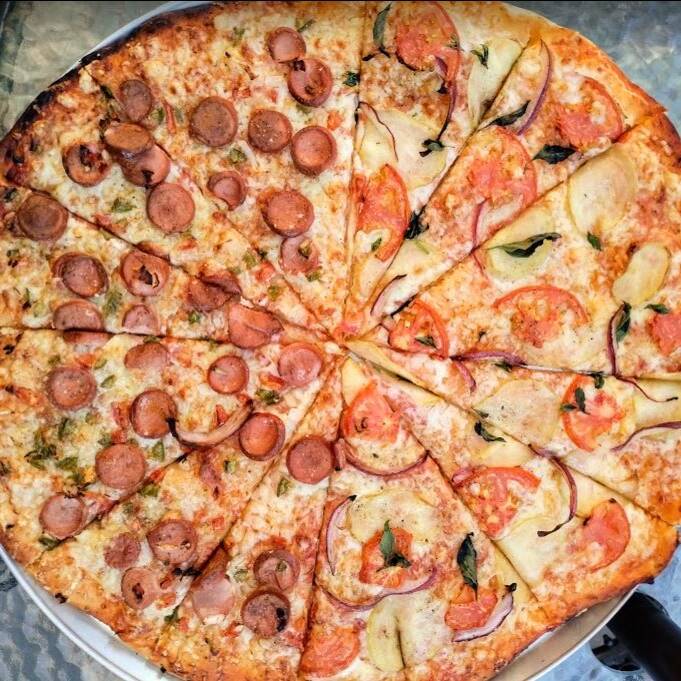 Base de pizza elaborada artesanalmente con masa madre, salsa de tomate casera, queso tipo Chihuahua, y 3 ingredientes a elegir. Tocino, chorizo, peperoni, salchicha, jamón, cebolla, champiñones, tomate, piña, chile jalapeño. 12 rebanadas