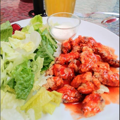 Pechuga de pollo fresco sazonado con una mezcla casera, empanizados de manera artesanal con la receta de la casa y fritos, bañados en salsa de su elección, acompañados con ensalada de lechuga y tomate, tiras de zanahoria y pepino y aderezo ranch.