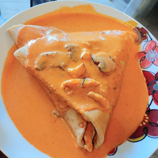 Base de crepa elaborada artesanalmente sobre crepera de 40cm de diámetro y doblada en forma triangular, con un toque de mayonesa y relleno de pollo en salsa de la casa cremosa de chipotle con champiñones salteados y queso gratinado tipo Chihuahua.