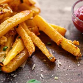 Papas a la francesa sazonadas con sal y queso parmesano, acompañado con salsa catsup y mayonesa.