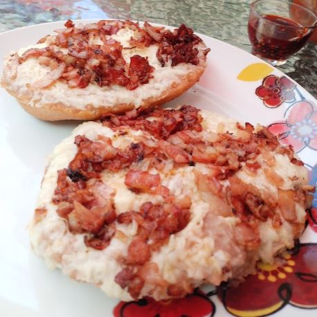 Base de pizza, salsa de tomate, queso, papa en rodajas, cebolla y queso crema. 12 rebanadas