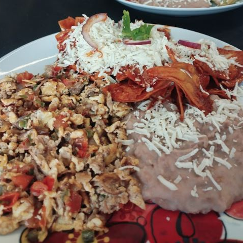2 piezas de huevo guisados con carne deshebrada, chile, tomate y cebolla, acompañados con frijoles refritos y papas a la mantequilla.