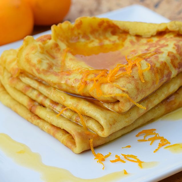 Base de crepa elaborada artesanalmente sobre crepera de 40cm de diámetro y doblada en forma triangular, bañada en salsa de la casa de naranja caramelizada.