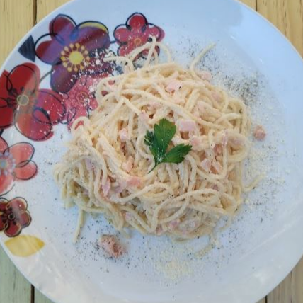Espagueti bañado en salsa de crema casera y tocino al vino blanco con queso tipo Chihuahua por encima.