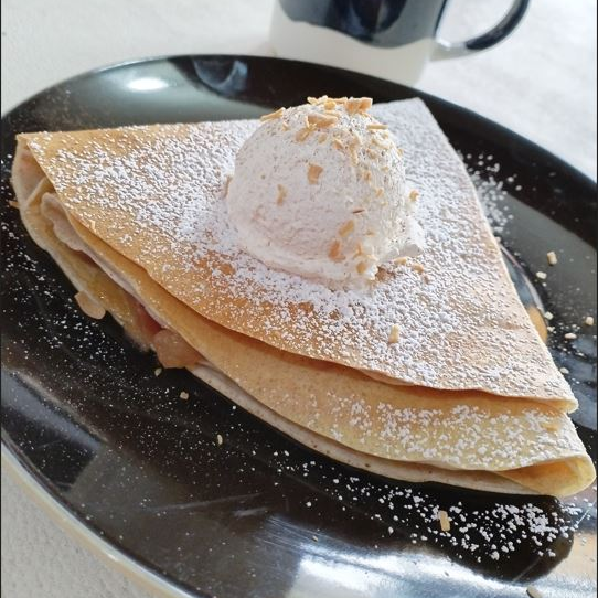 Base de crepa elaborada artesanalmente sobre crepera de 40cm de diámetro y doblada en forma triangular, rellena de una mezcla de la casa de manzana en trozos caramelizada con canela.