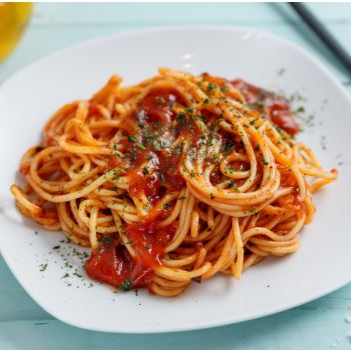 Espagueti bañado en salsa de tomate casera y queso tipo Chihuahua por encima