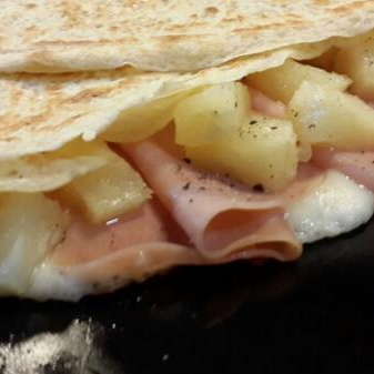 Base de crepa elaborada artesanalmente sobre crepera de 40cm de diámetro y doblada en forma triangular, con un toque de mayonesa y relleno de jamón, piña y queso gratinado tipo Chihuahua.
