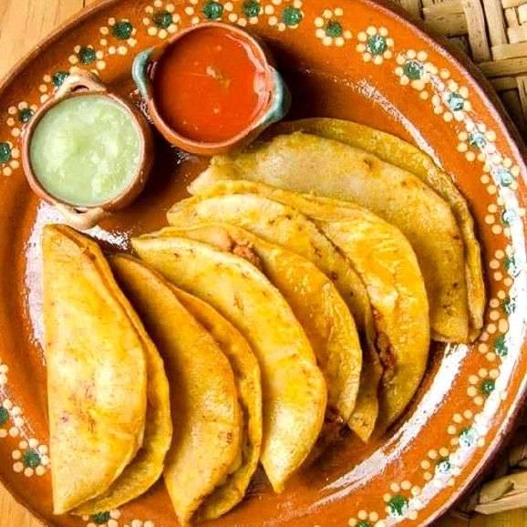 Deliciosa tortilla de maíz amarillo relleno de rica deshebrada, acompañado de sus pócimas mágicas salsa, repollo, limón, aderezo y cebolla morada con habanero.