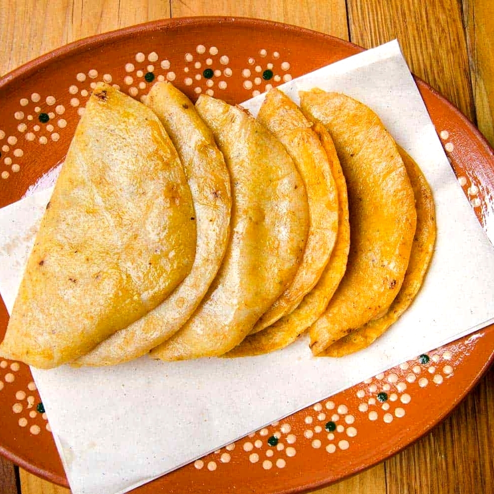 Deliciosa tortilla de maíz amarillo relleno de rica papa, acompañado de sus pócimas mágicas salsa, repollo, limón, aderezo y cebolla morada con habanero.