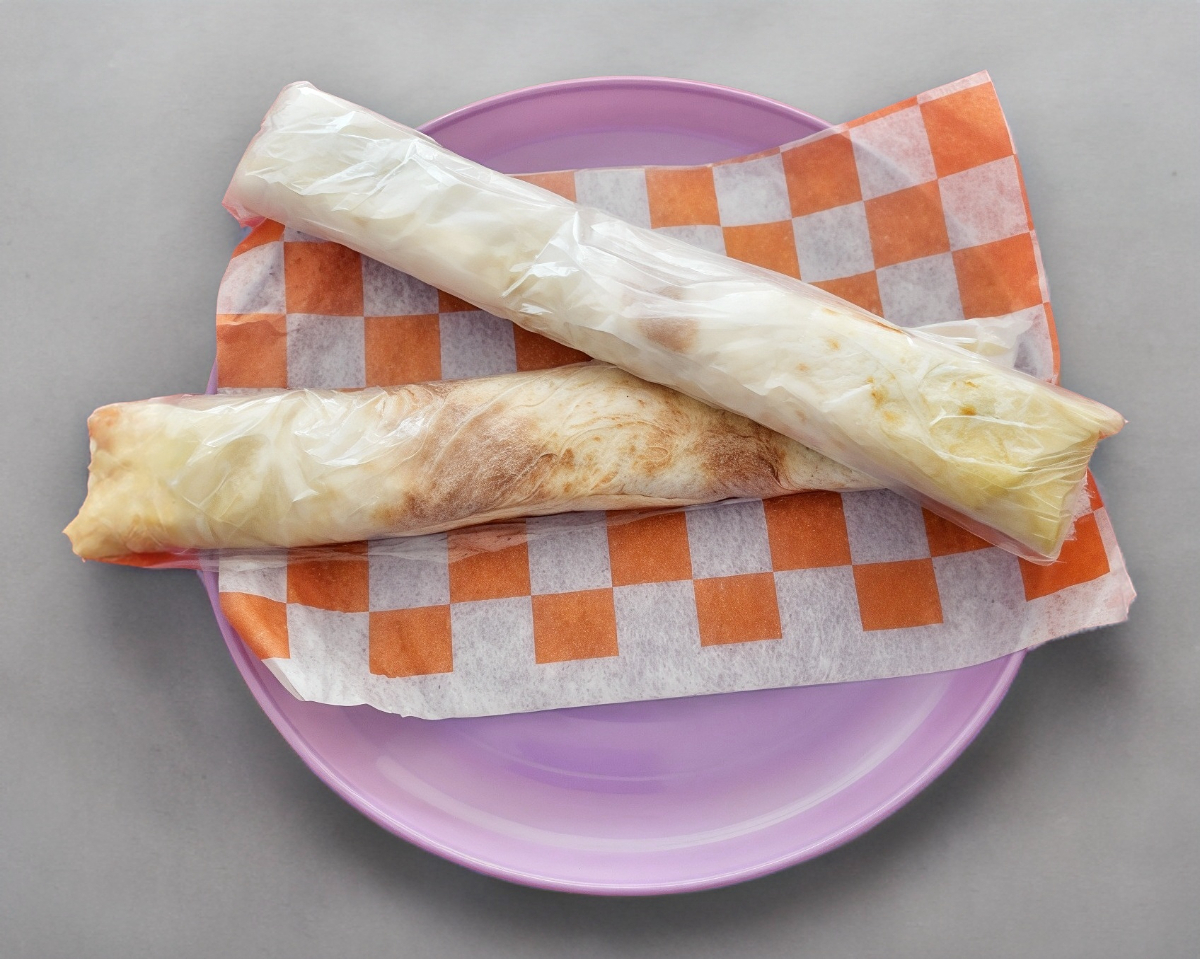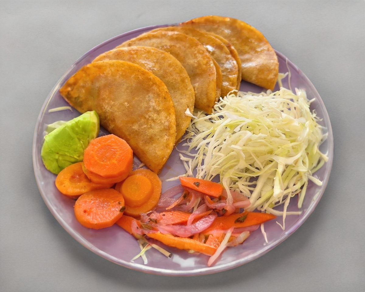 1 Taco de deshebrada, 1 taco combinado, 2 tacos de papa y 1 taco de frijol, acompañados de repollo finamente rallado y salsa.