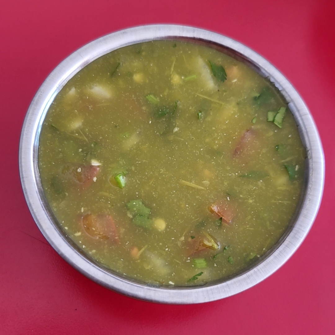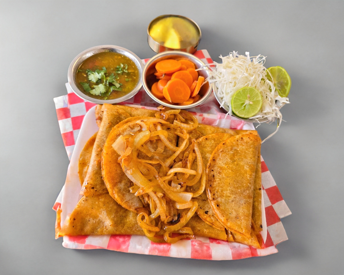 5 Tacos: 1 deshebrada, 1 chicharrón, , 1 Deshebrada/frijol 1 papa y 1 frijol, acompañados de salsa verde con tomate, cebolla, cilantro y repollo finamente picado.