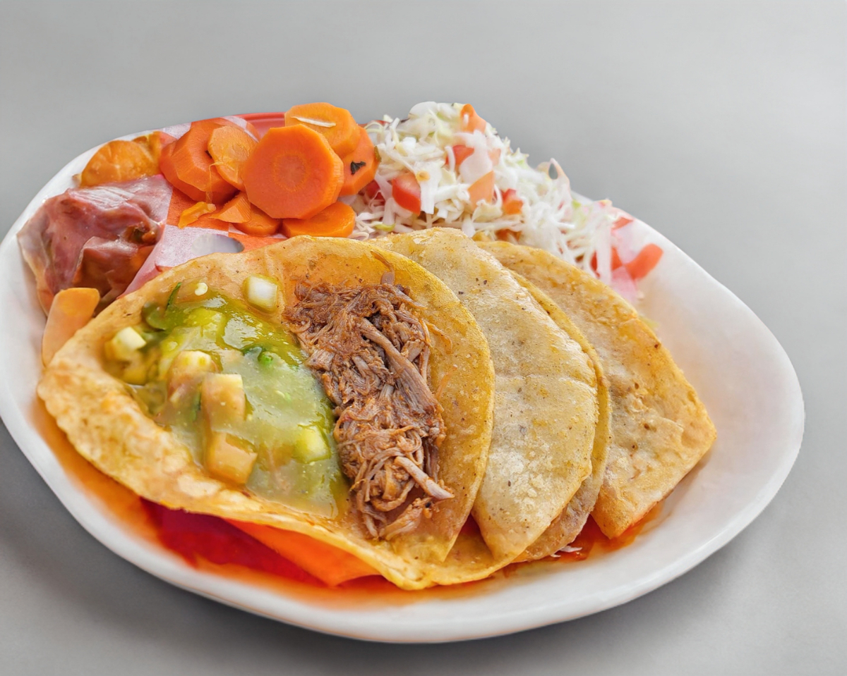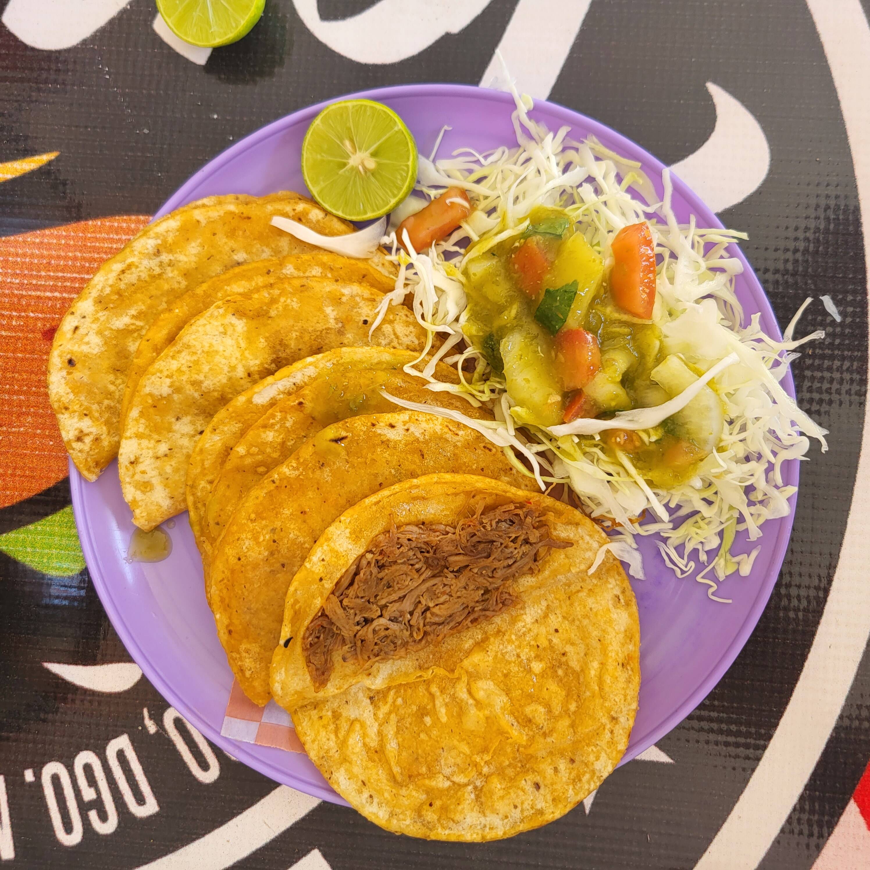 Taco con tortilla de maiz relleno carne deshebrada, chile colorado, acompañado con repollo finamente rallado, salsa verde con tomate, cebolla y cilantro picado (no pica).
