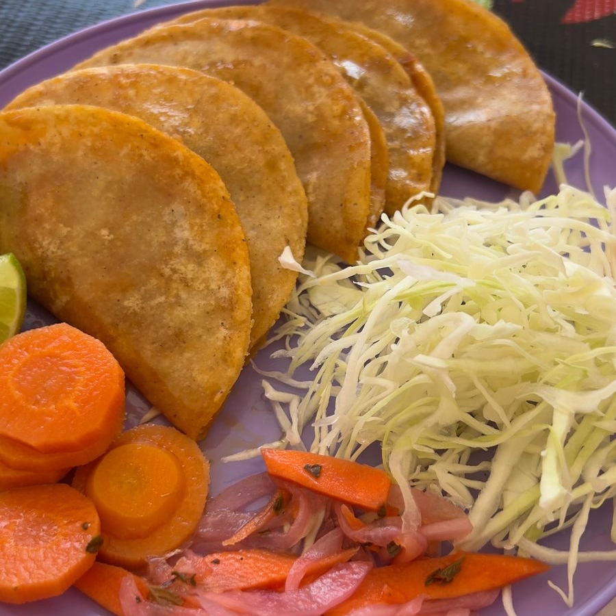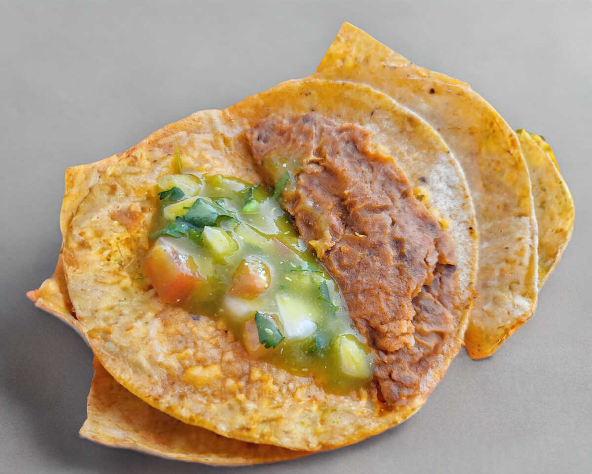 5 Tacos de frijol con deshebrada, acompañados de salsa verde con tomate, cebolla, cilantro y repollo finamente picado.