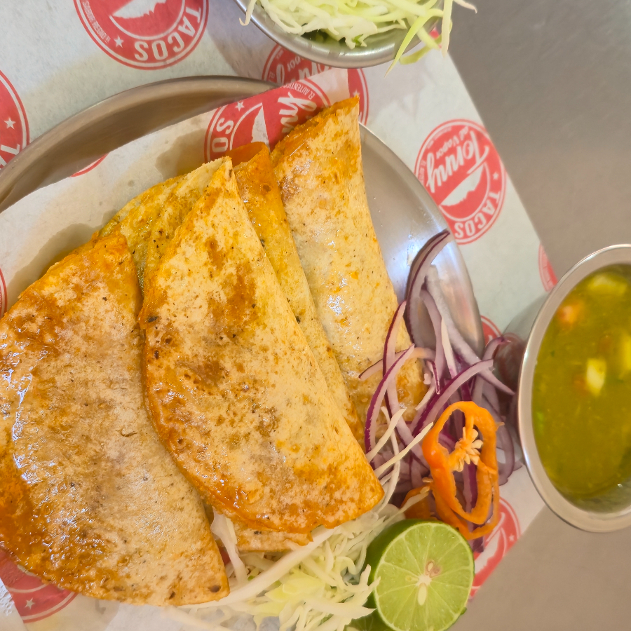 5 Tacos de chicharrón prensado premium, acompañados de salsa verde con tomate, cebolla, cilantro y repollo finamente picado.