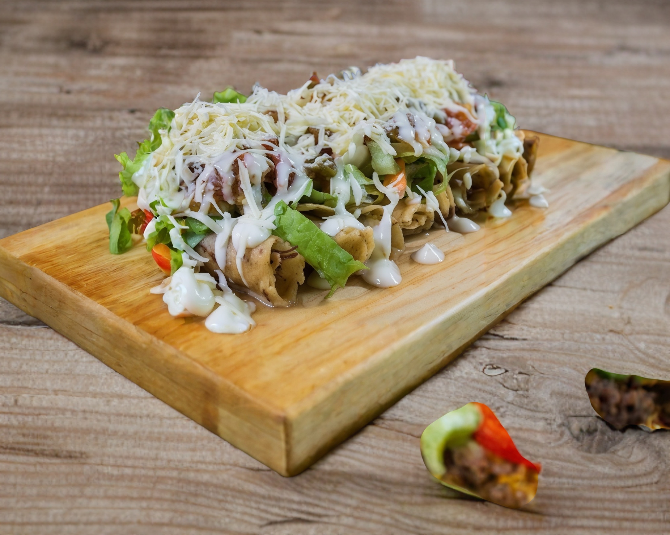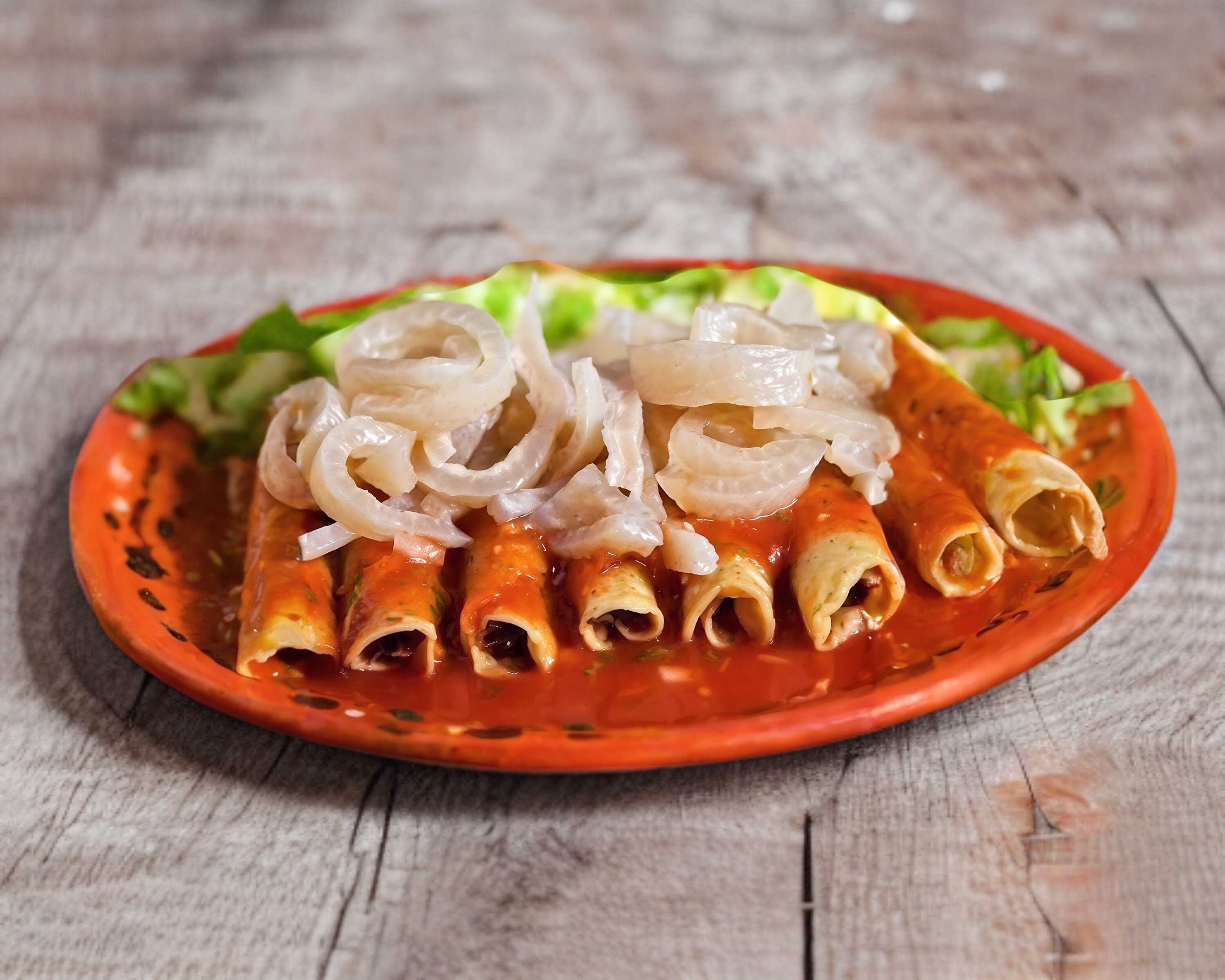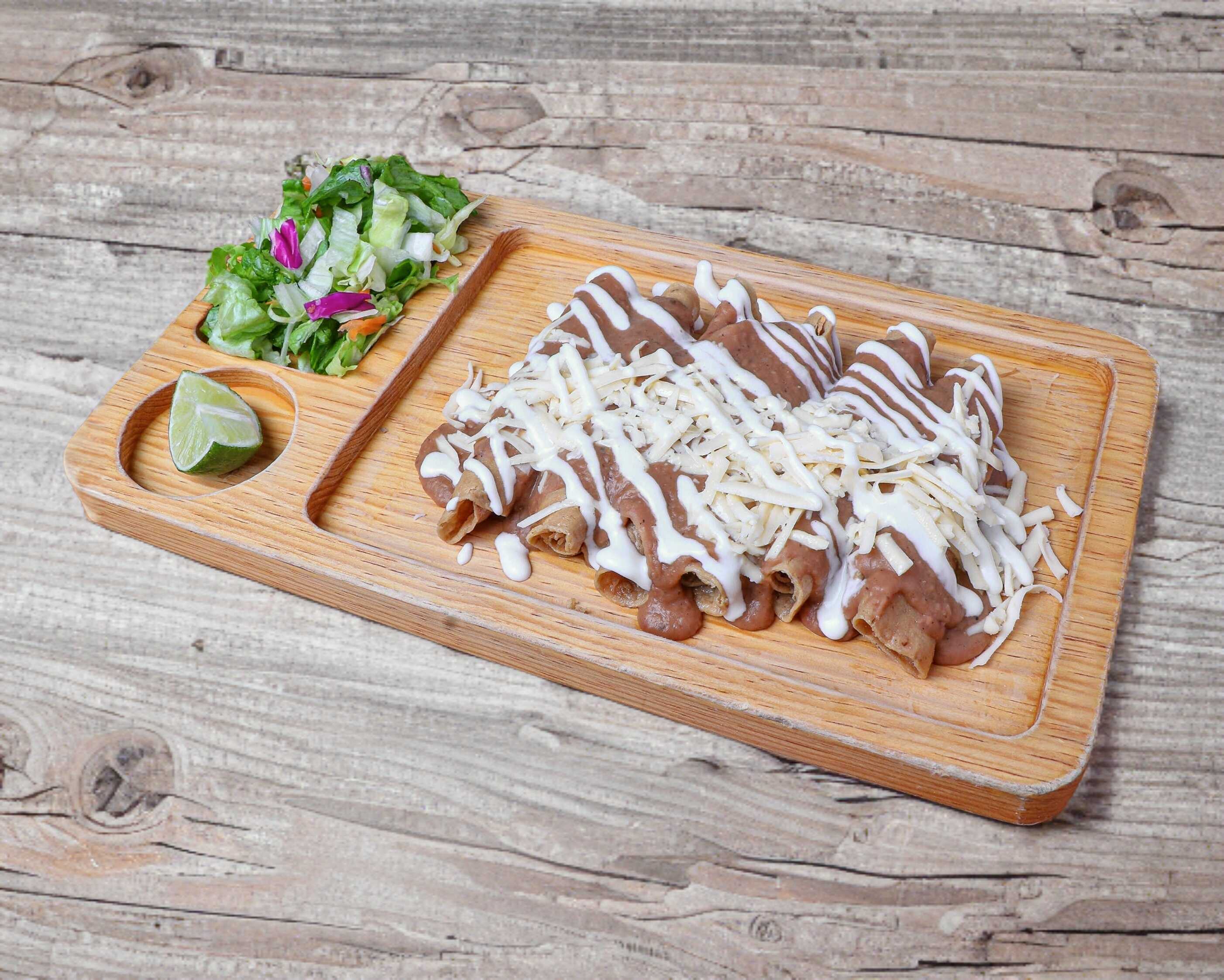 Elige orden completa o media Orden. Orden de Tacos Dorados decorados con queso y crema