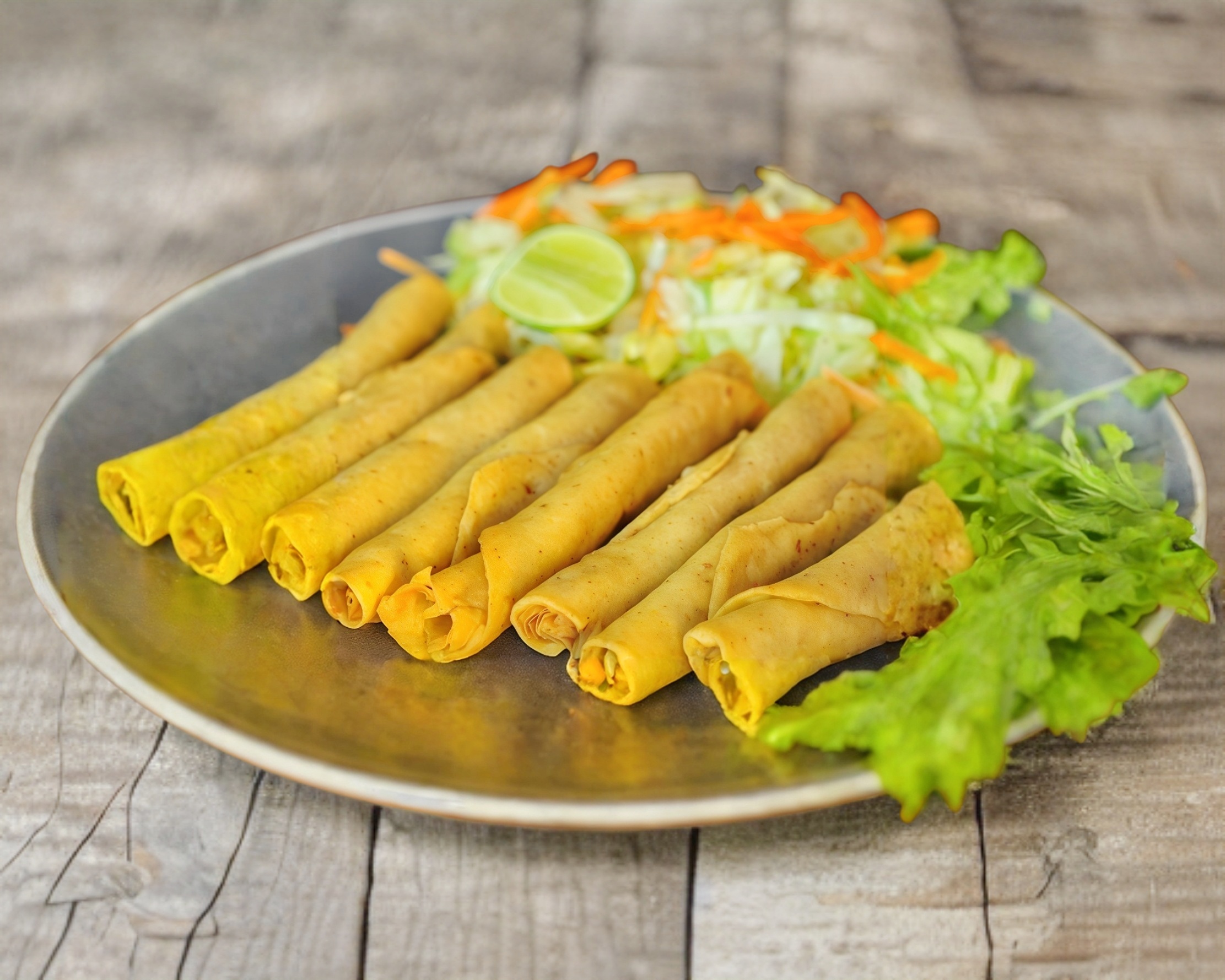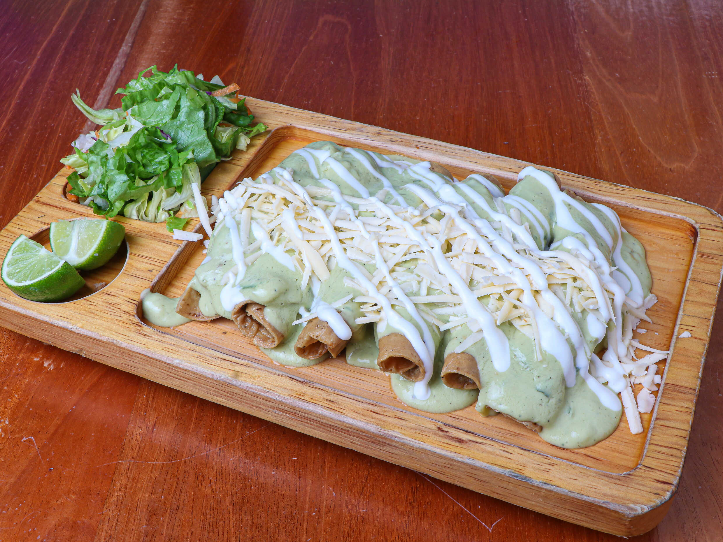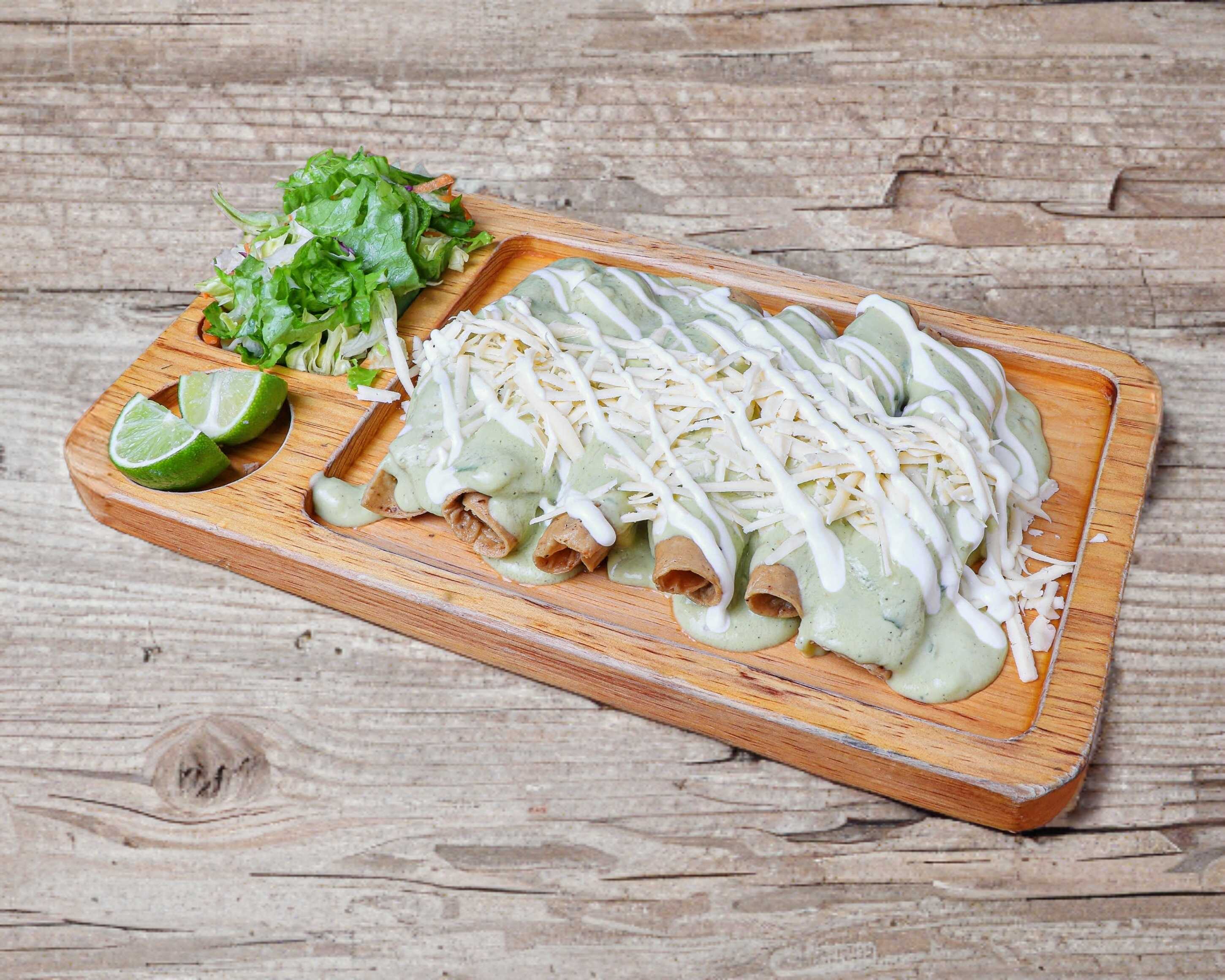 6 Tacos (tortilla tipo 12 mediana) Bañados en una salsa de Aguacate super cremosa con queso menonita y crema, ensalada y papita cambray