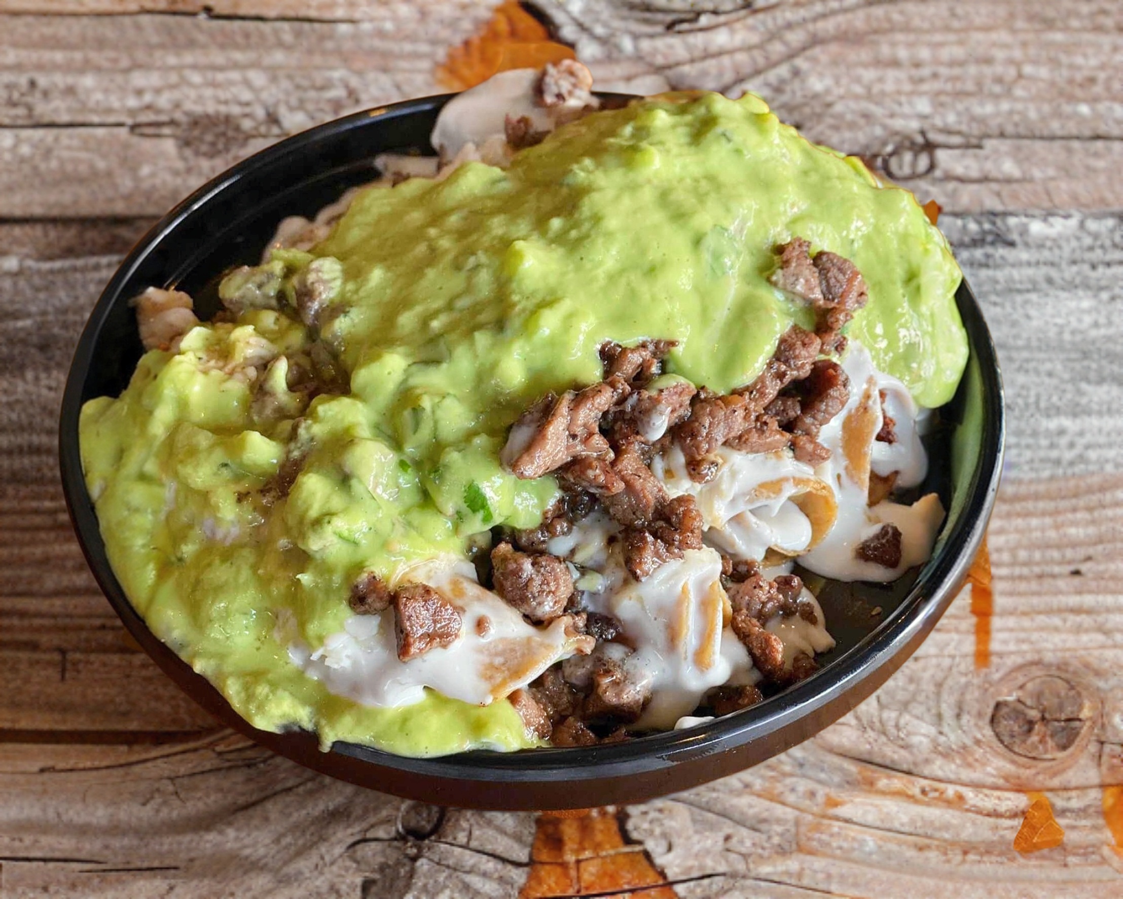 6 Tacos de Res, con queso y crema, con topping de 180 gr de carne bañados en salsa de aguacate